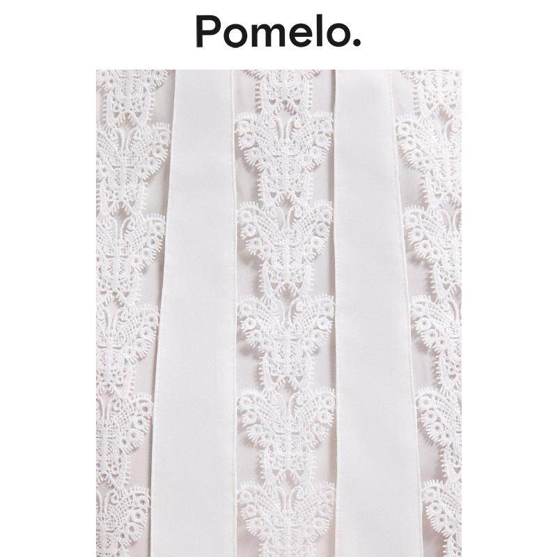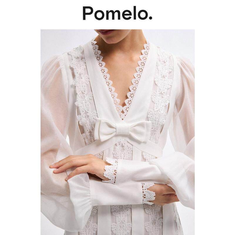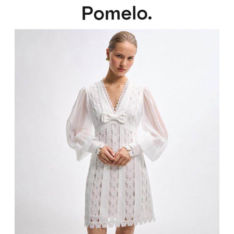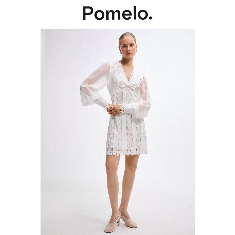 Pomelo 白色蕾丝连衣裙女V领蝴蝶结长袖温柔风小个子短款连衣裙
