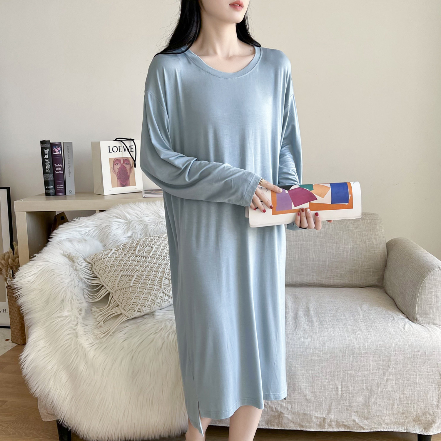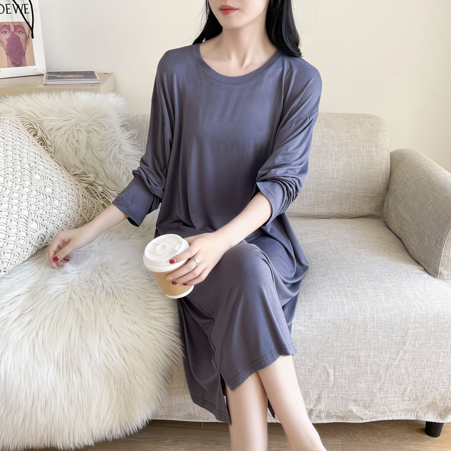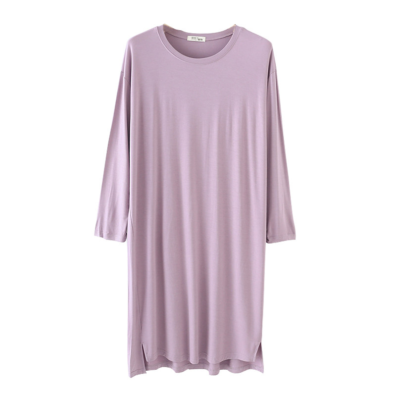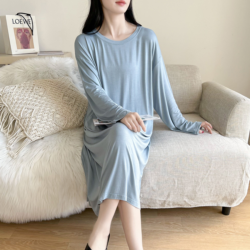 莫代尔长袖睡裙女春夏季薄款胖mm孕妇月子连衣裙大码休闲家居睡衣