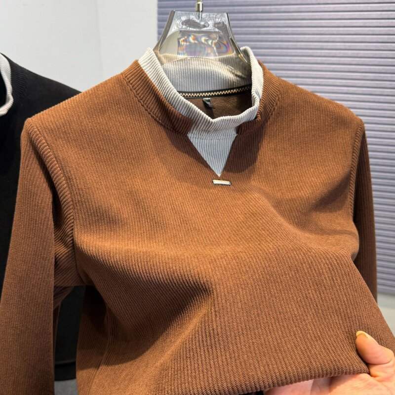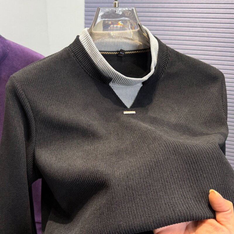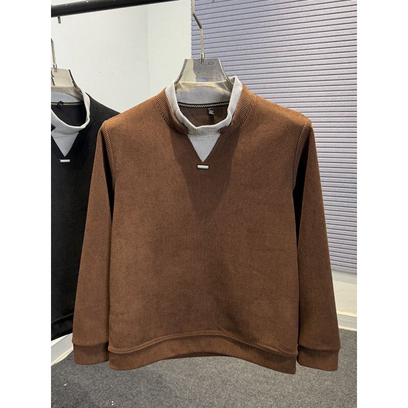 青少年半高领假两件加绒卫衣男冬季男款纯色套头一体绒时尚上衣服