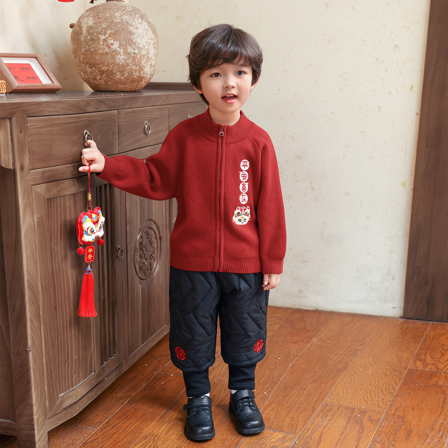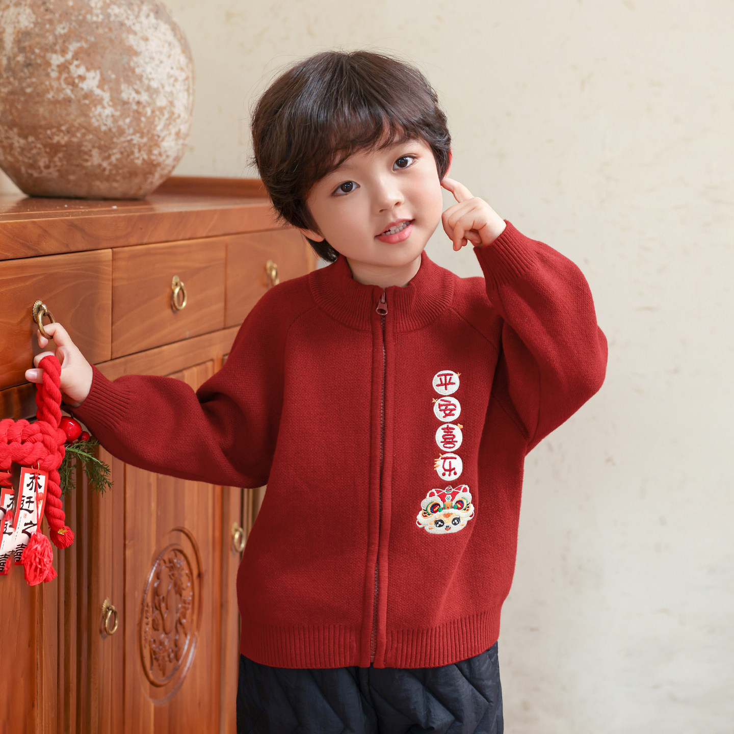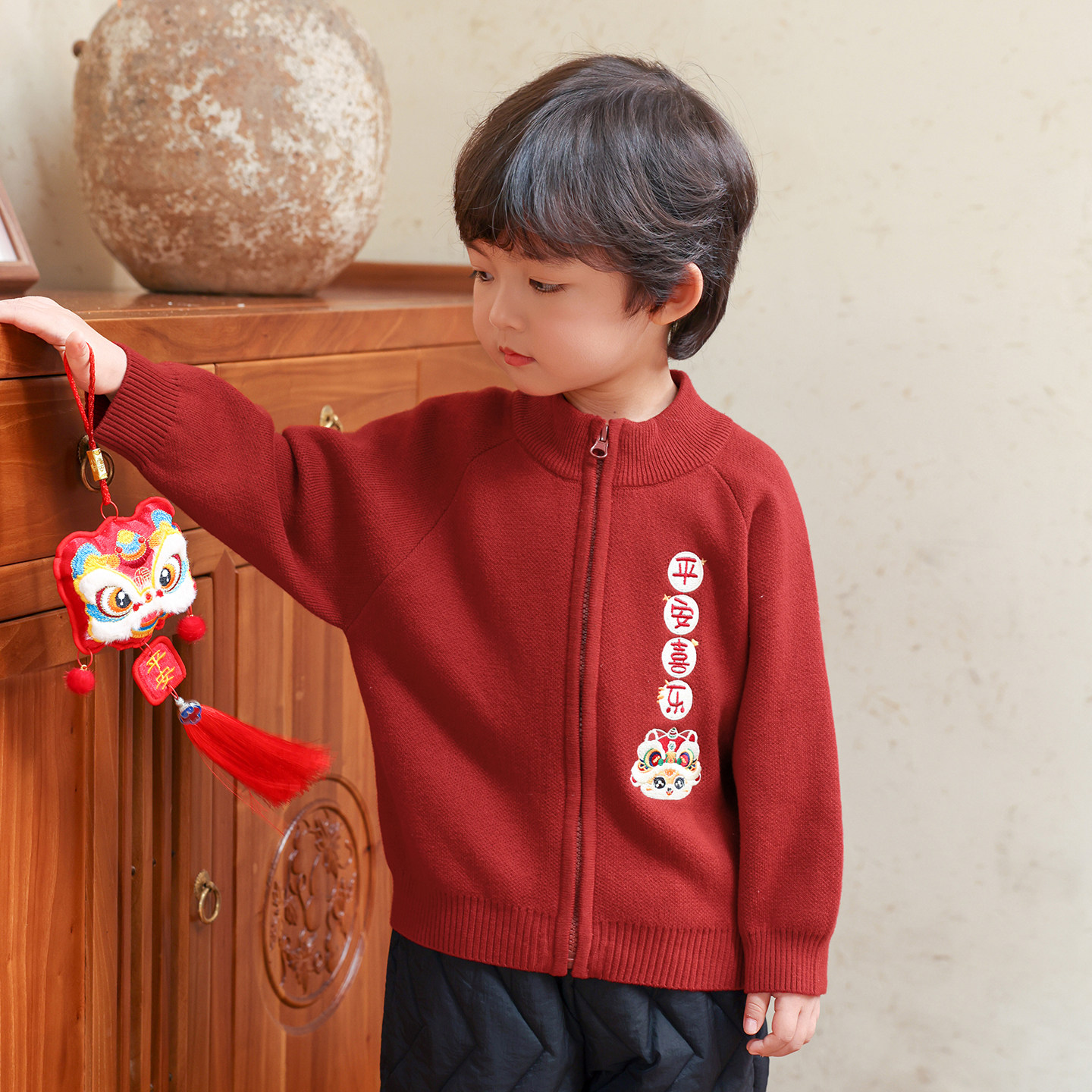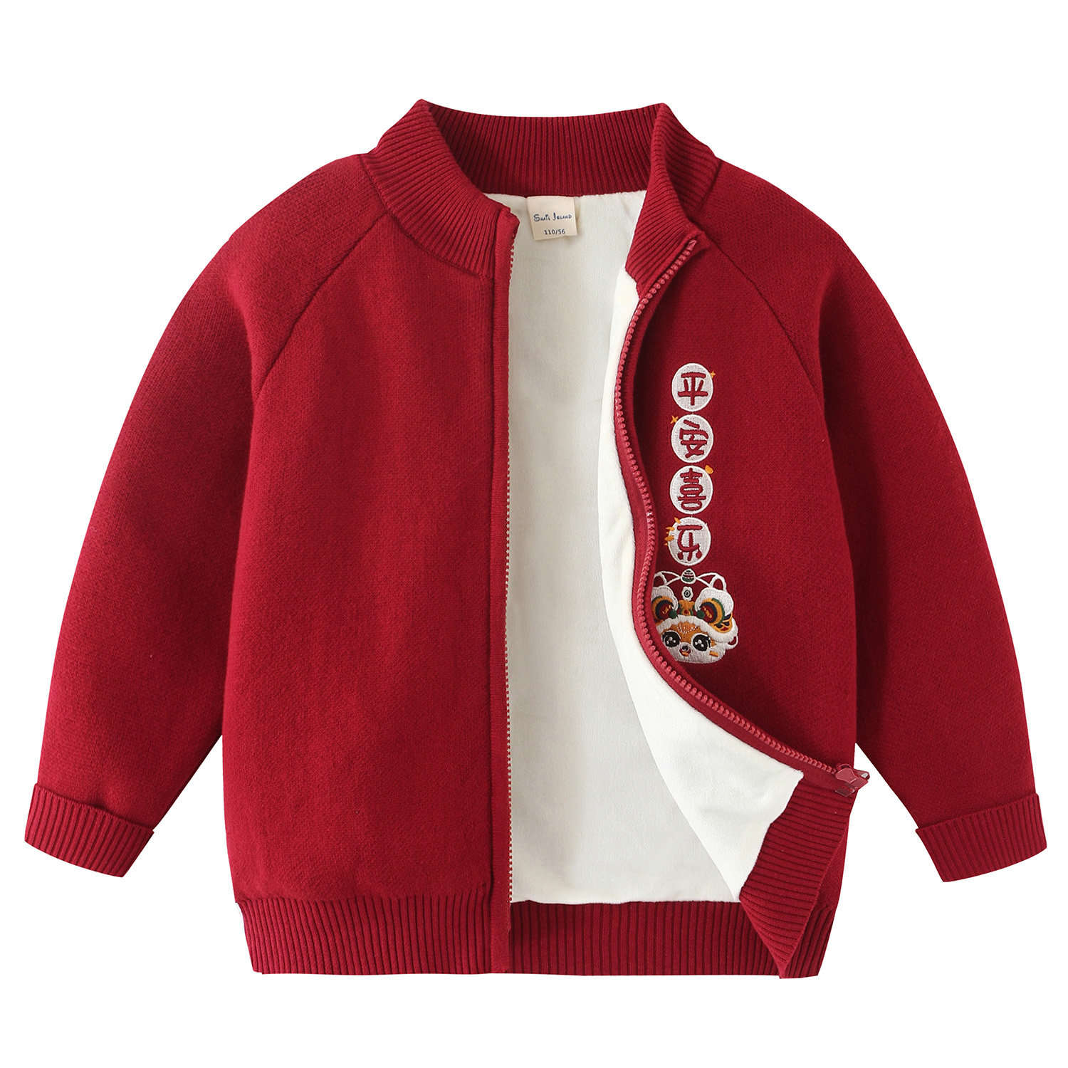 男童纯棉毛衣开衫冬季拉链针织衫外套2026新款宝宝红色新年服8219