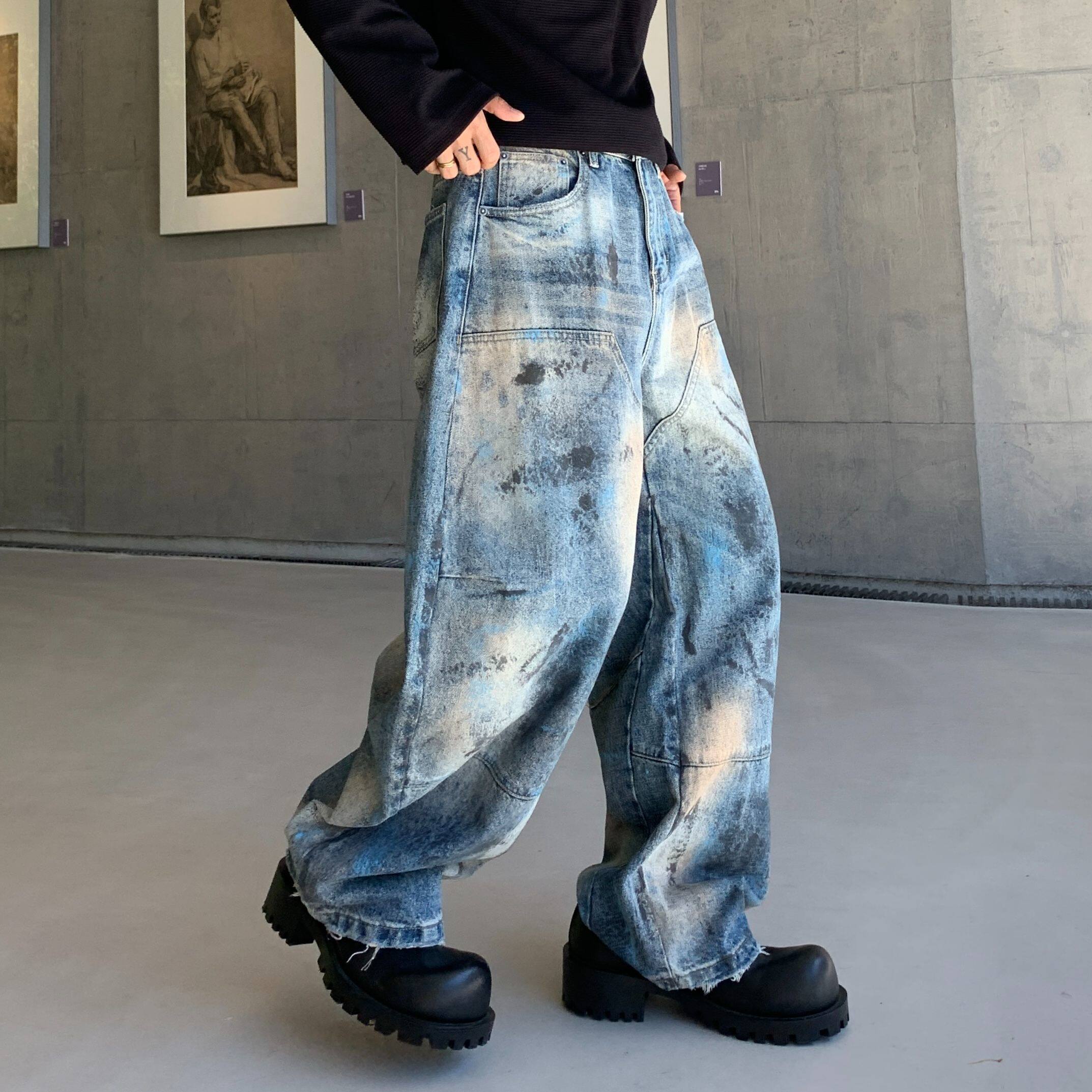 巴黎风格美式复古高街潮牌宽松直筒弯刀牛仔裤男女款阔腿裤长裤子