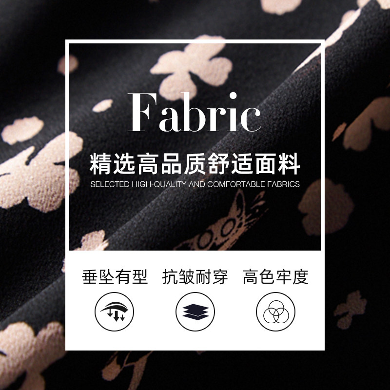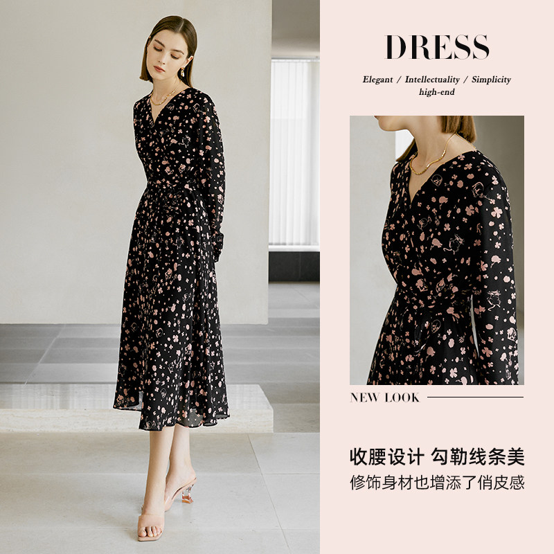 颜域长袖V领茶歇连衣裙女秋装2025新款轻熟收腰显瘦气质碎花长裙