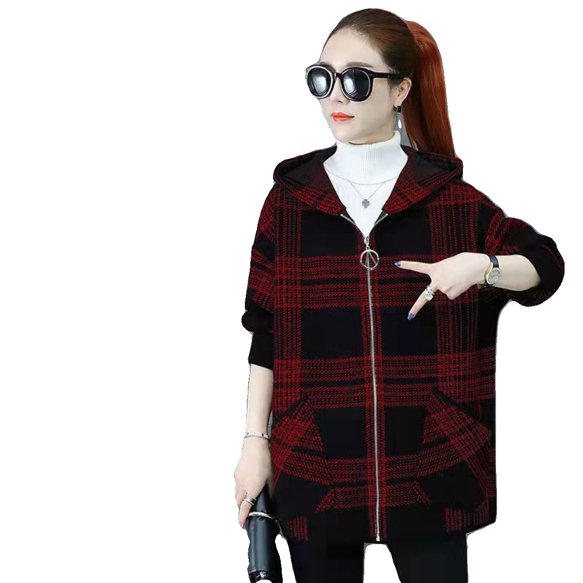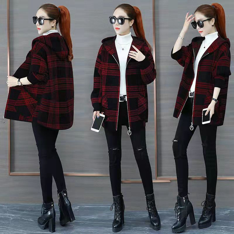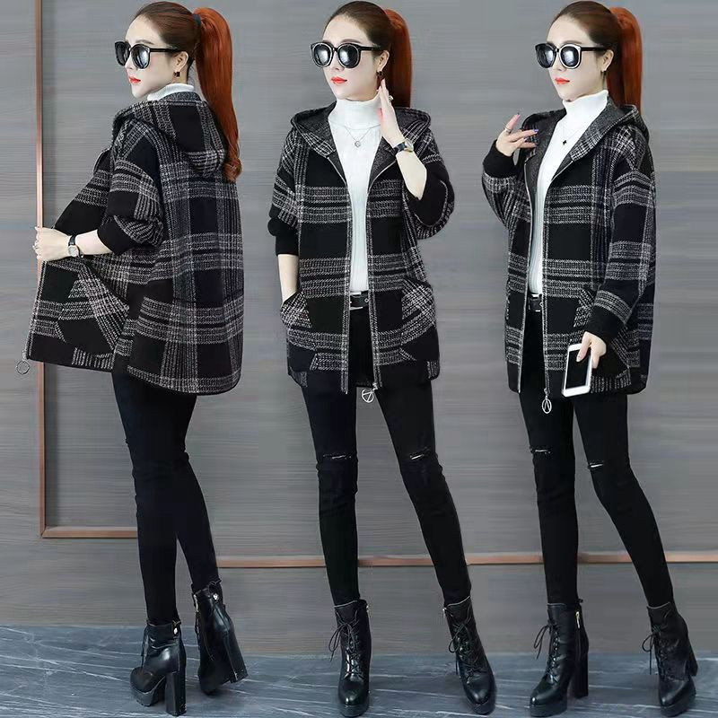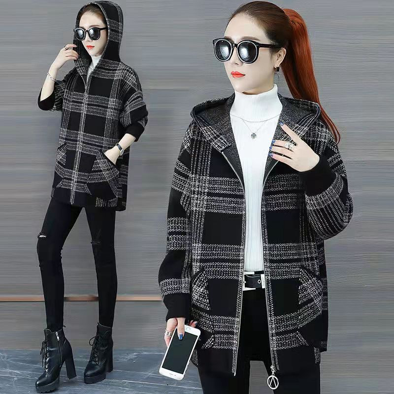 加绒加厚大码300斤格子外套秋冬款胖mm宽松开衫中长款连帽卫衣女