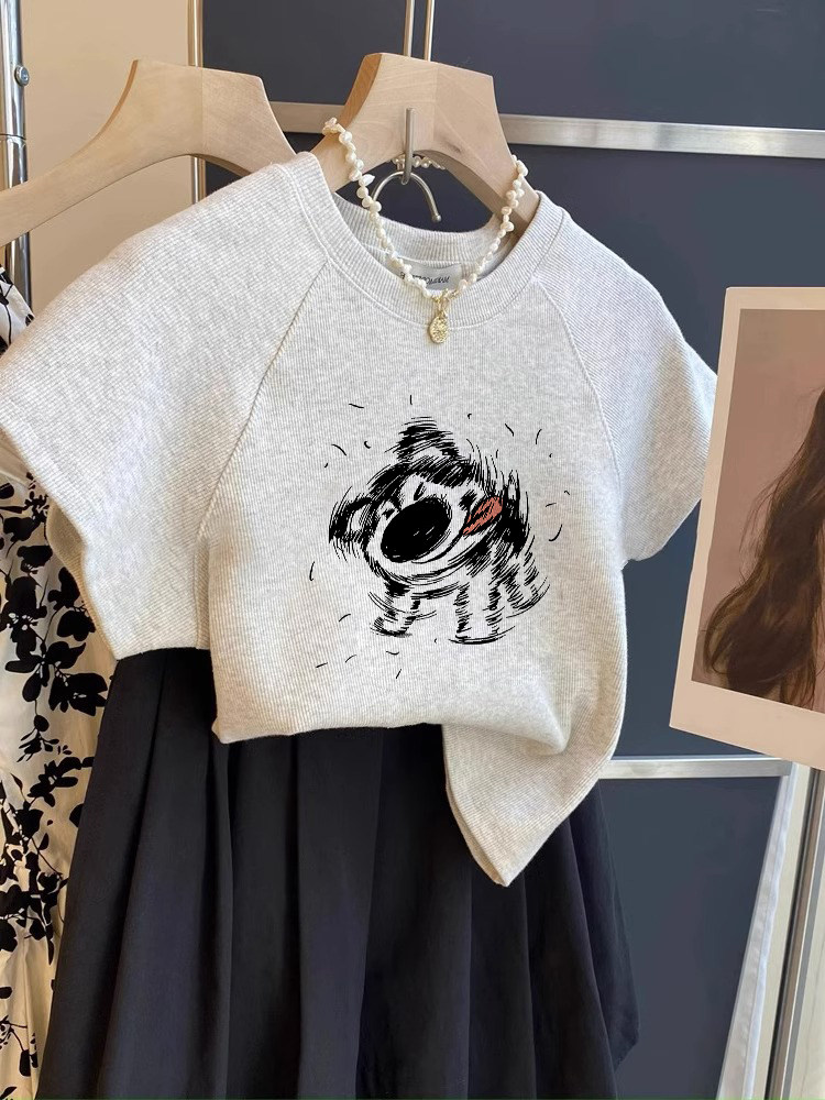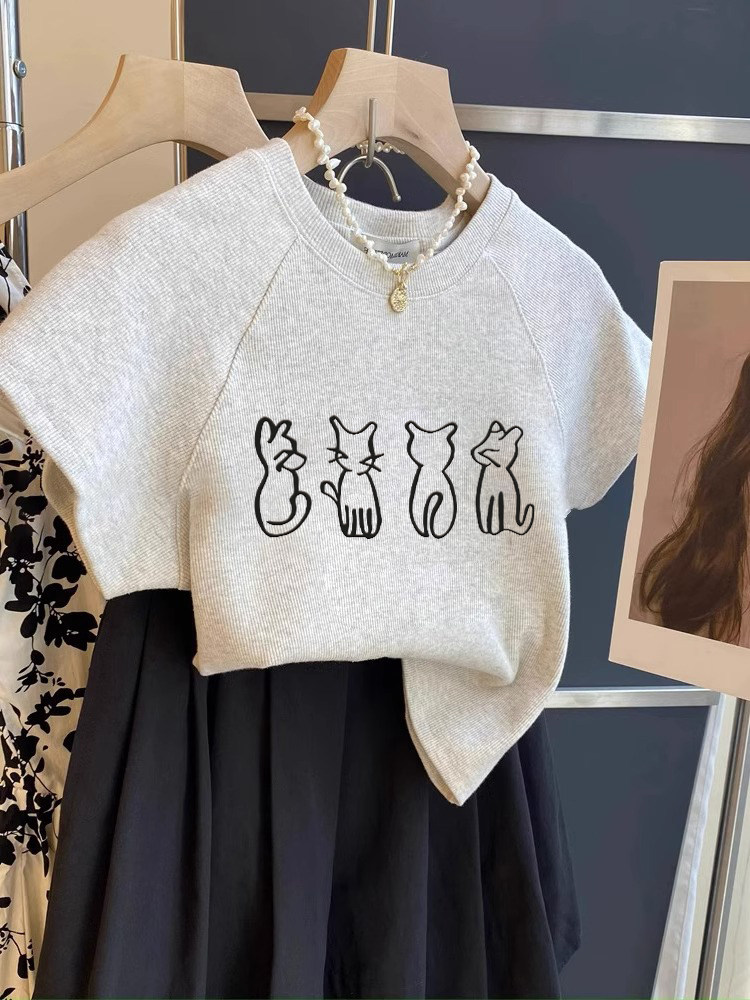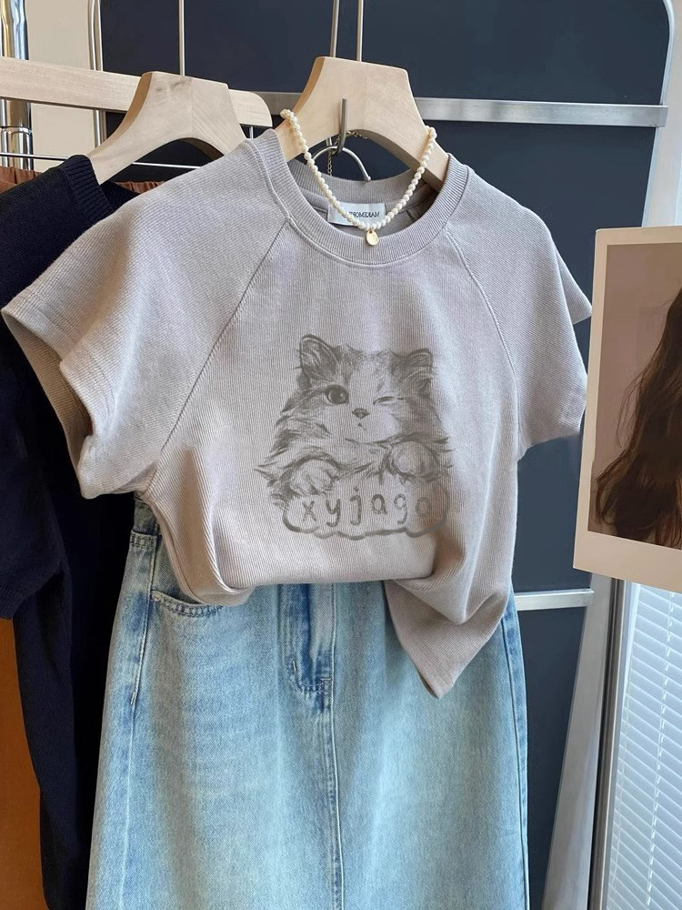 洋气修身短袖小上衣女款2026新款重磅棉小猫印花短款t恤衫夏季ins