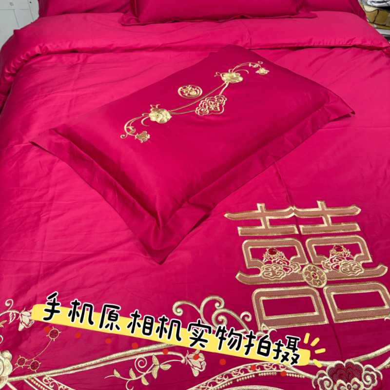 120支新疆长绒棉婚庆四件套中式酒红色纯棉刺绣全棉结婚床上用品4
