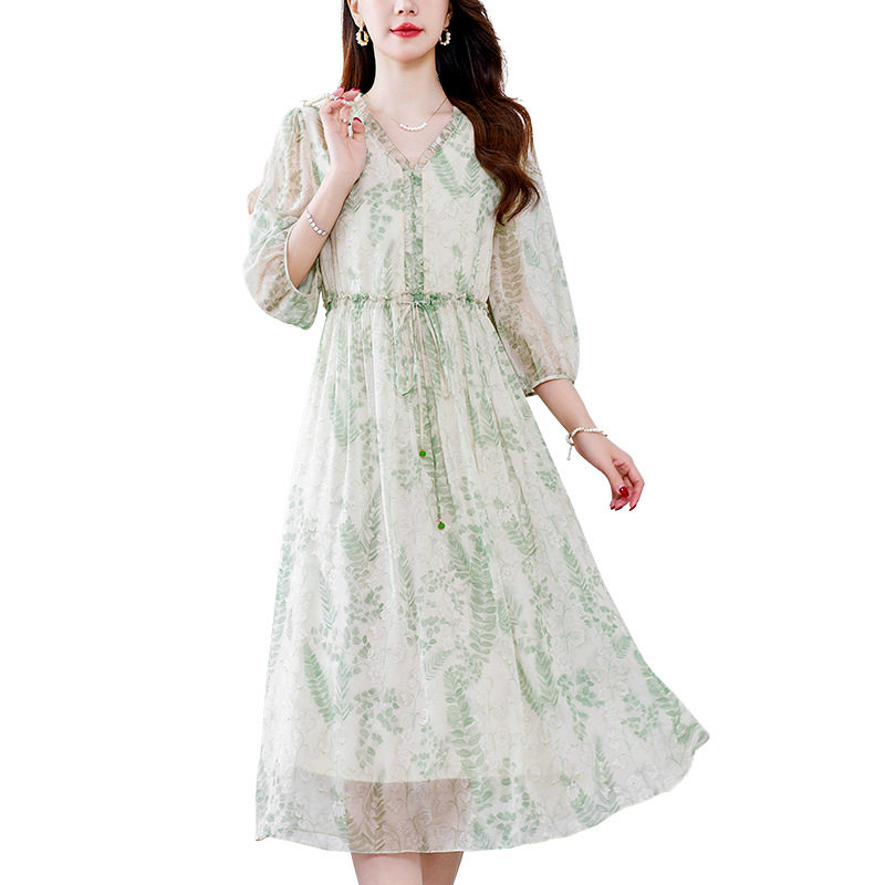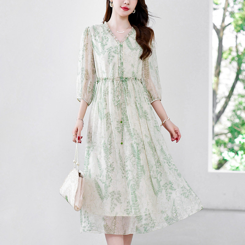 法式温柔风桑蚕丝碎花连衣裙V领收腰A字裙春夏度假清新真丝中长裙