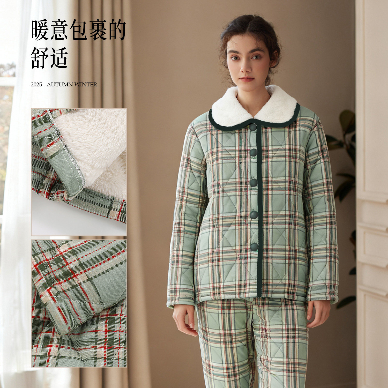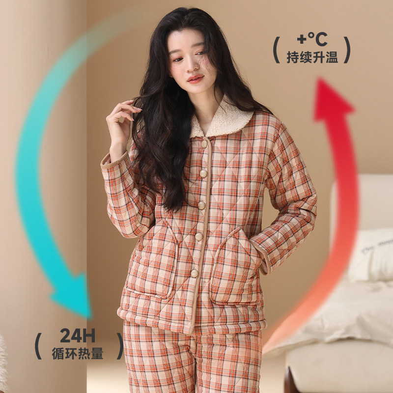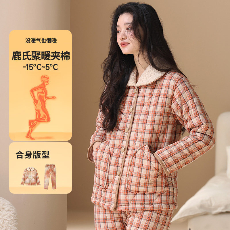 秋鹿三层加厚夹棉睡衣女秋冬季新款格子保暖棉袄家居服套装可外穿