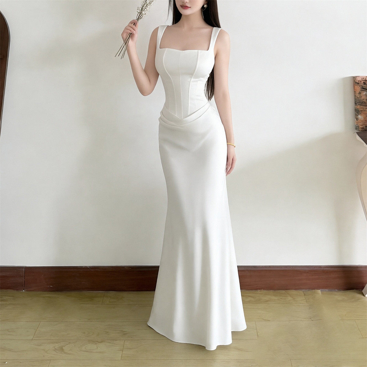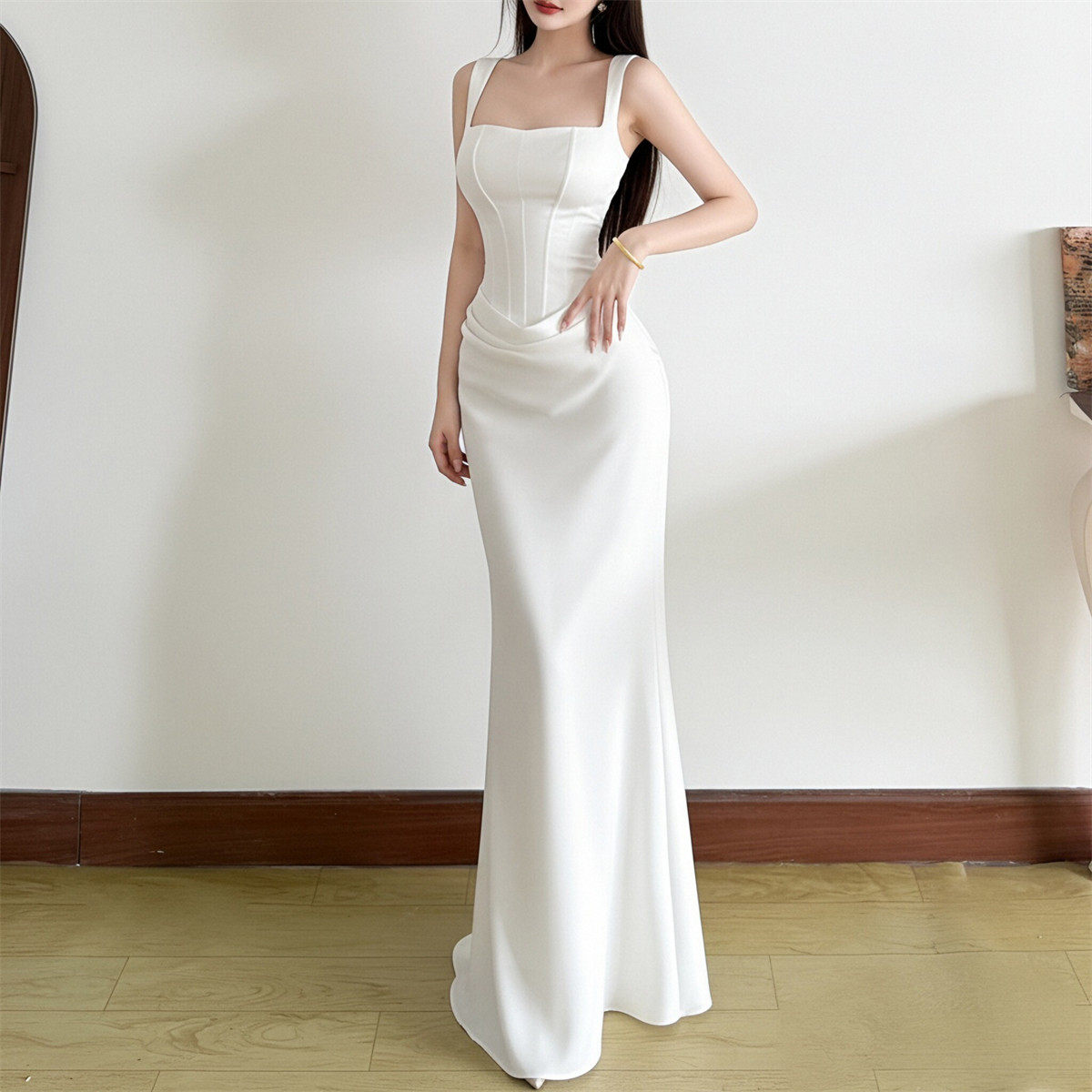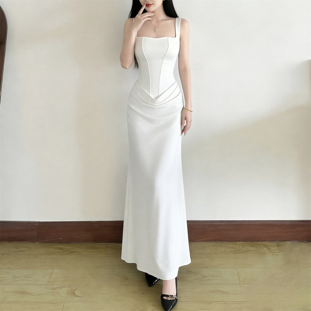 黑色长款鱼尾裙新款吊带收腰褶皱显瘦温柔气质优雅连衣裙日常可穿