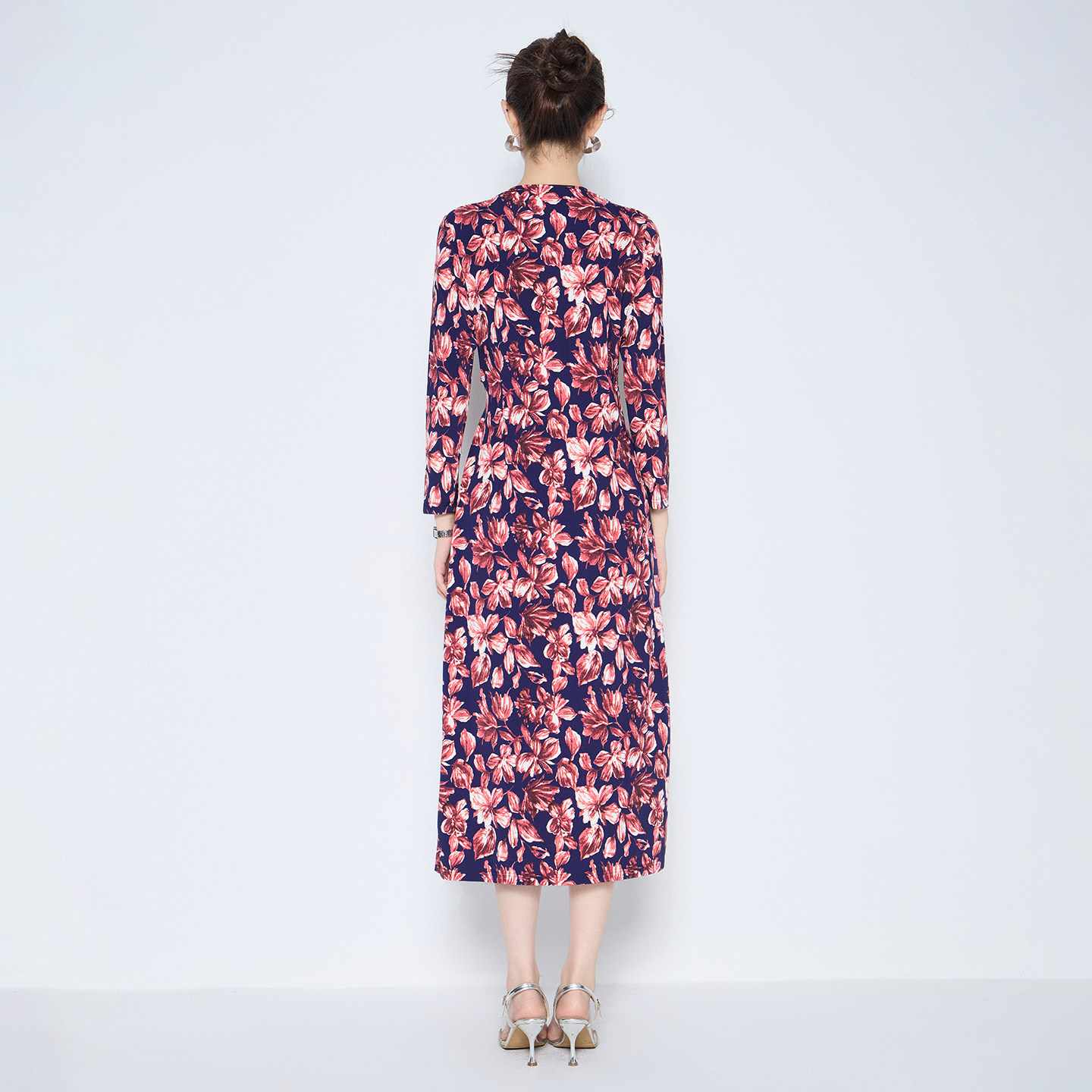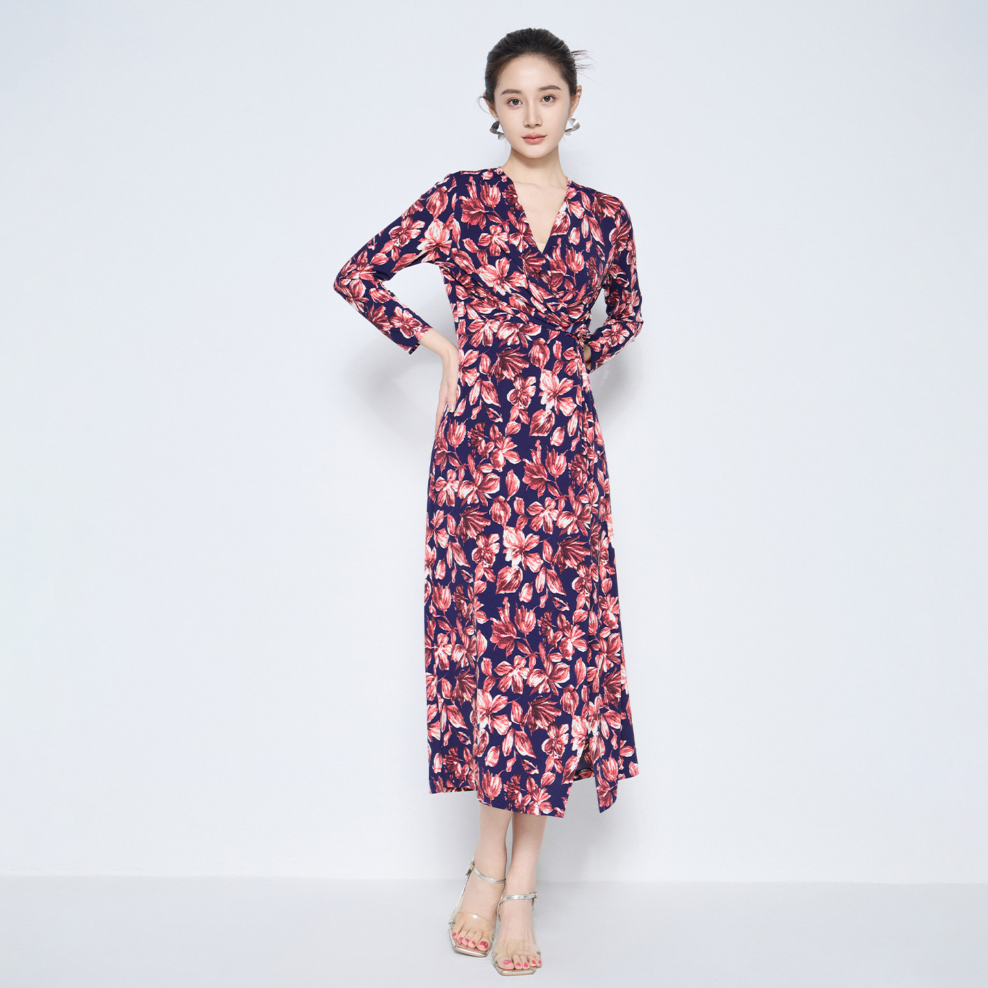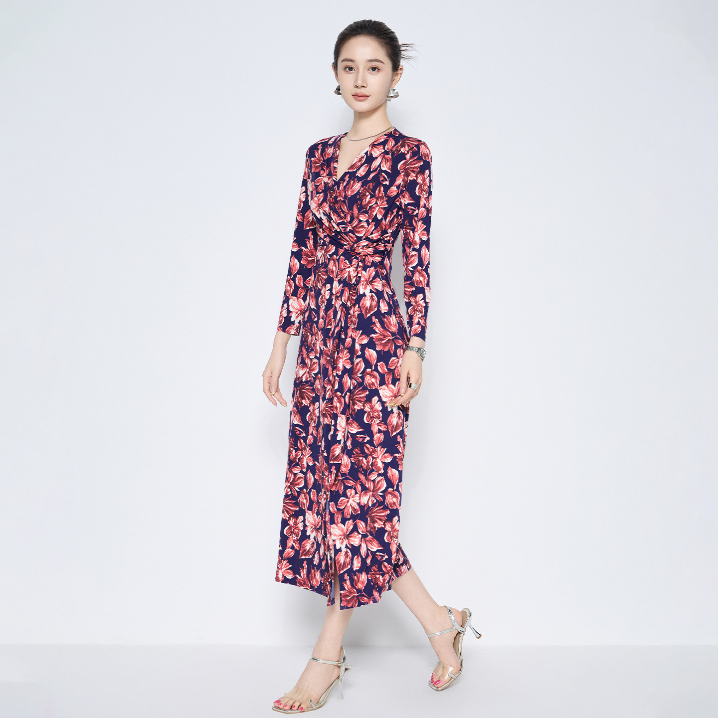 马天奴2026春夏新款粉色印花V领收腰长袖连衣裙子长裙气质时尚女