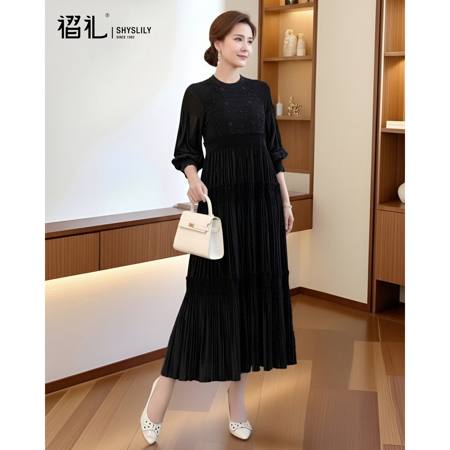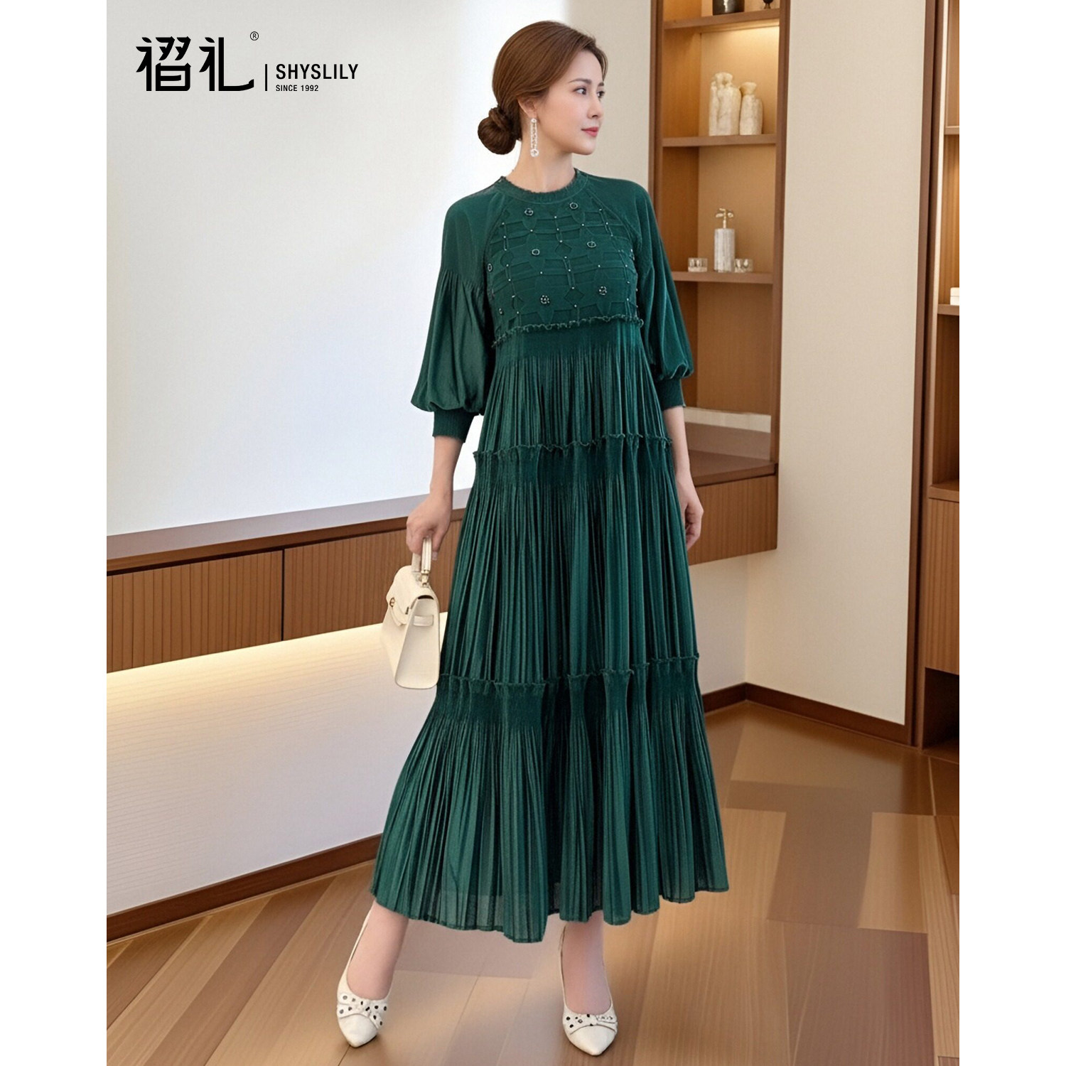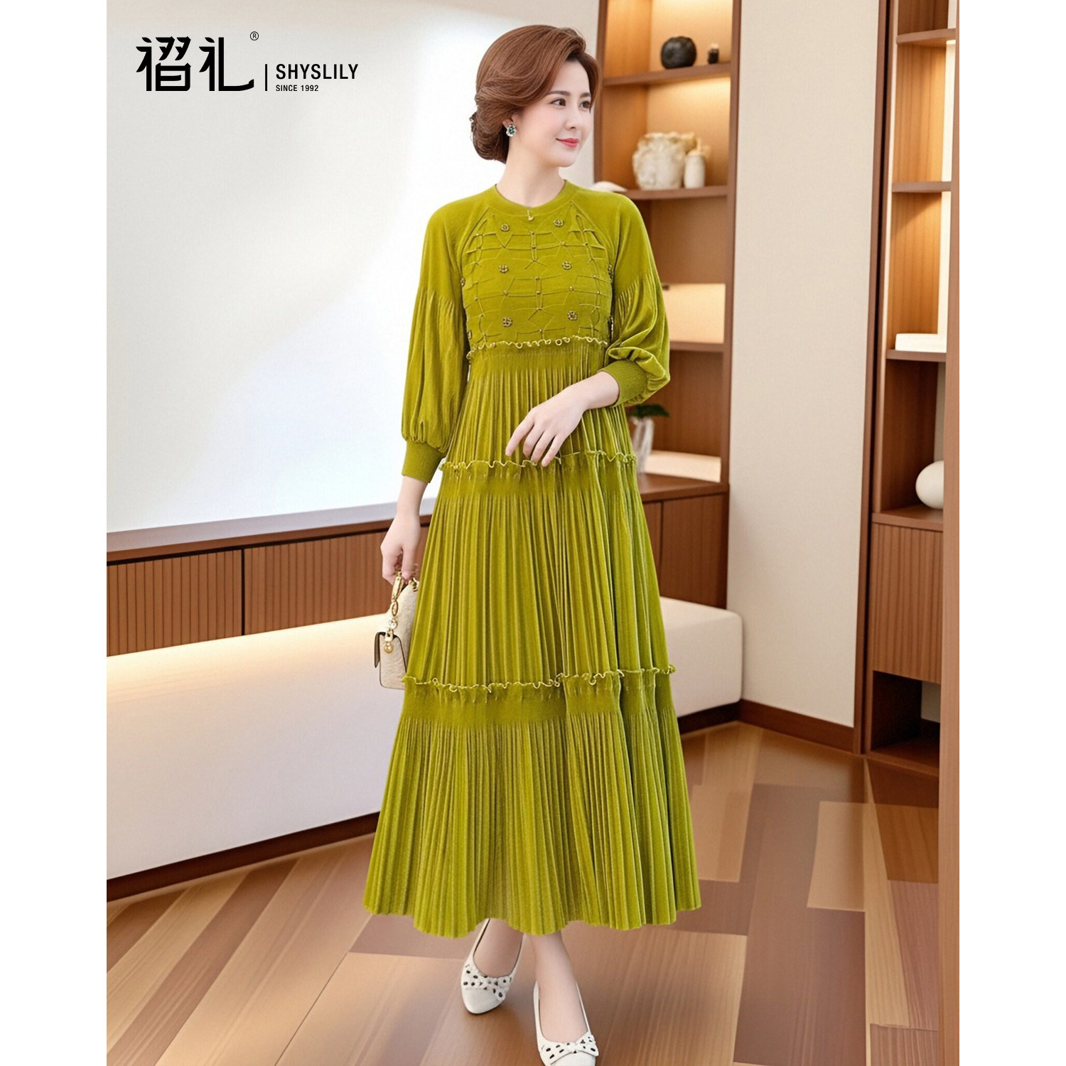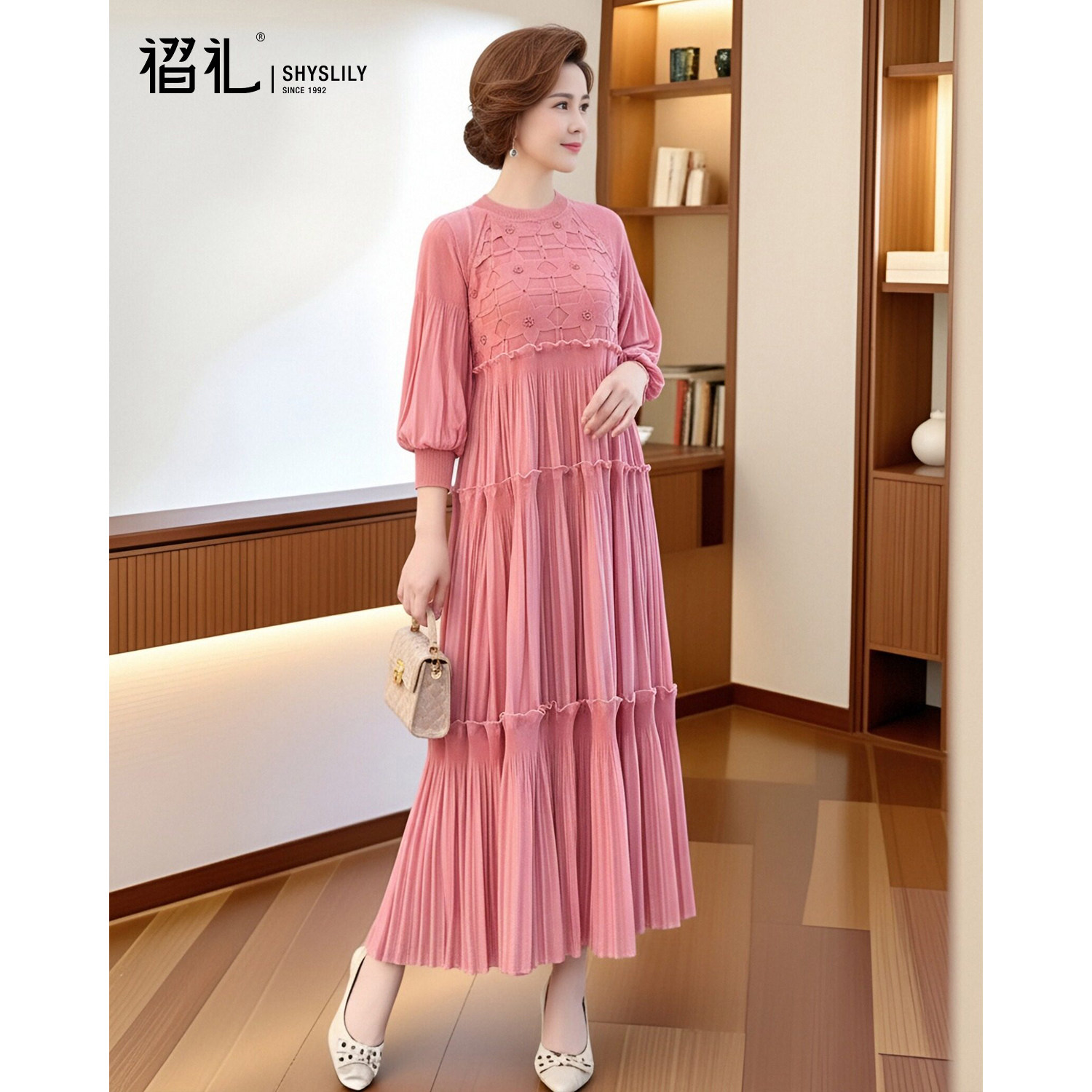 高端精致白色连衣裙宽松大码褶皱长裙洋气减龄气质大方妈妈裙子春