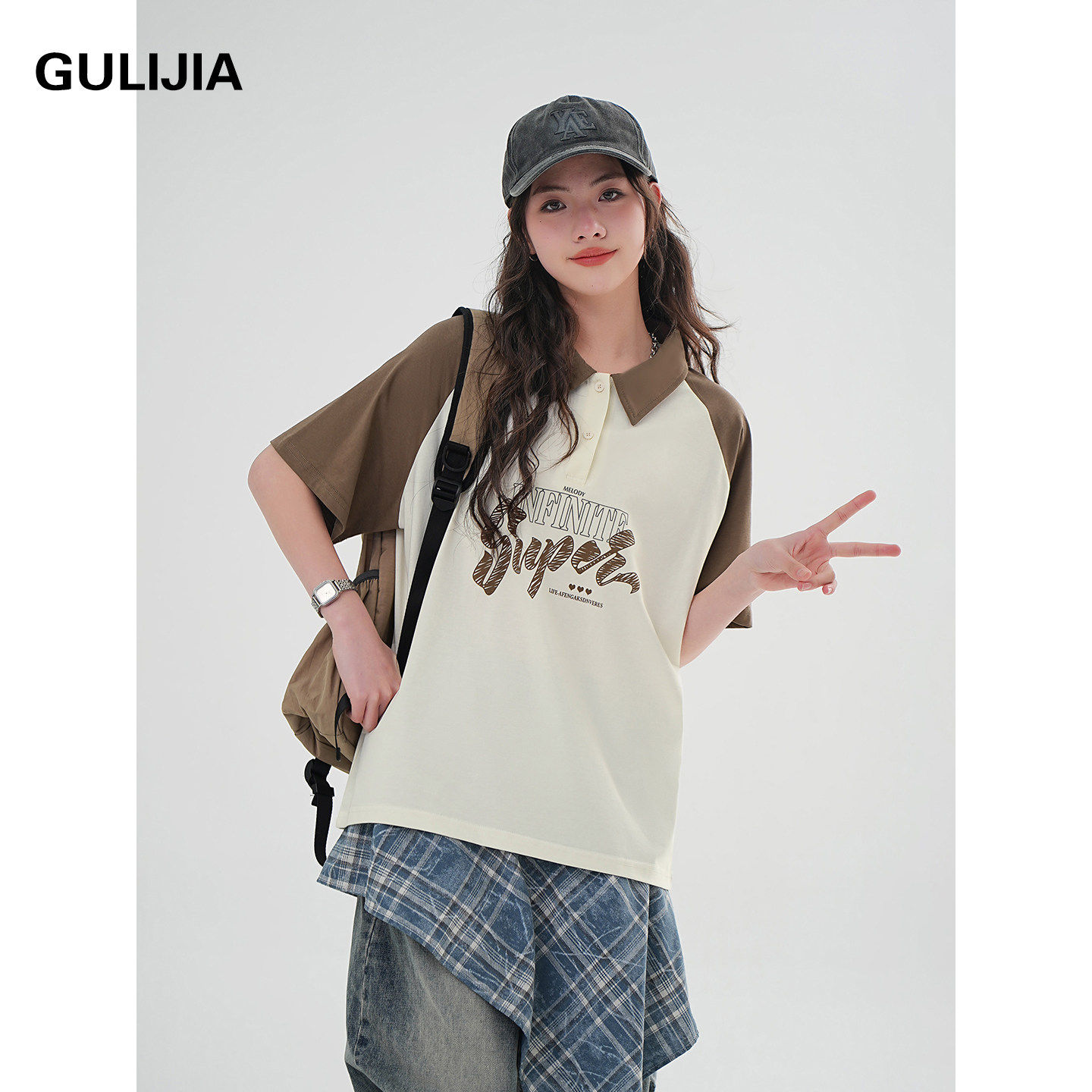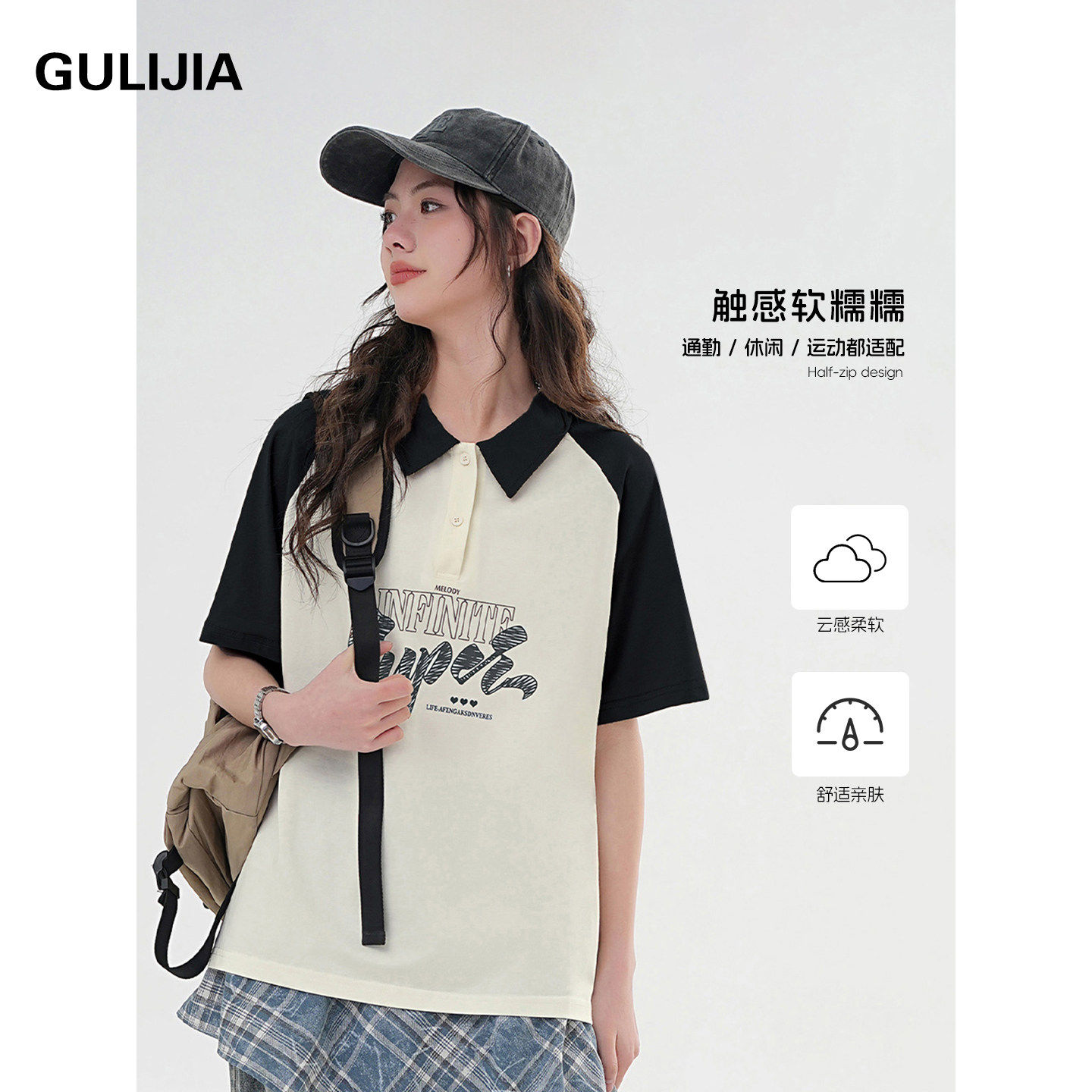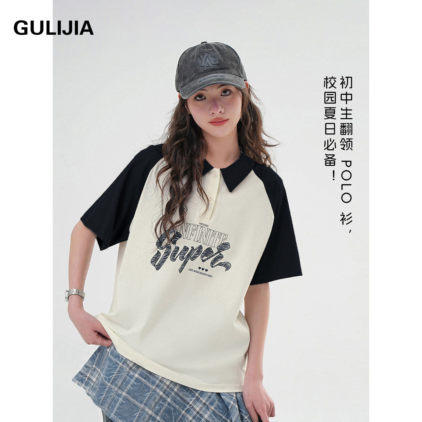 优蜜屋夏装学院风POLO领短袖T恤女大童字母宽松百搭初中生上衣15