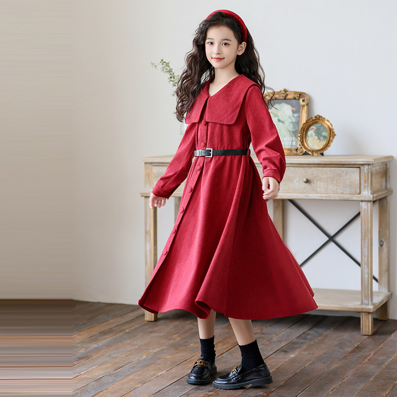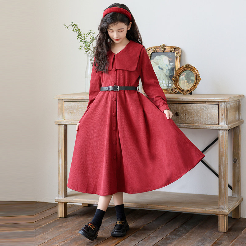 中大女童连衣裙2026春装新款洋气长袖裙子复古灯芯绒中长款公主裙
