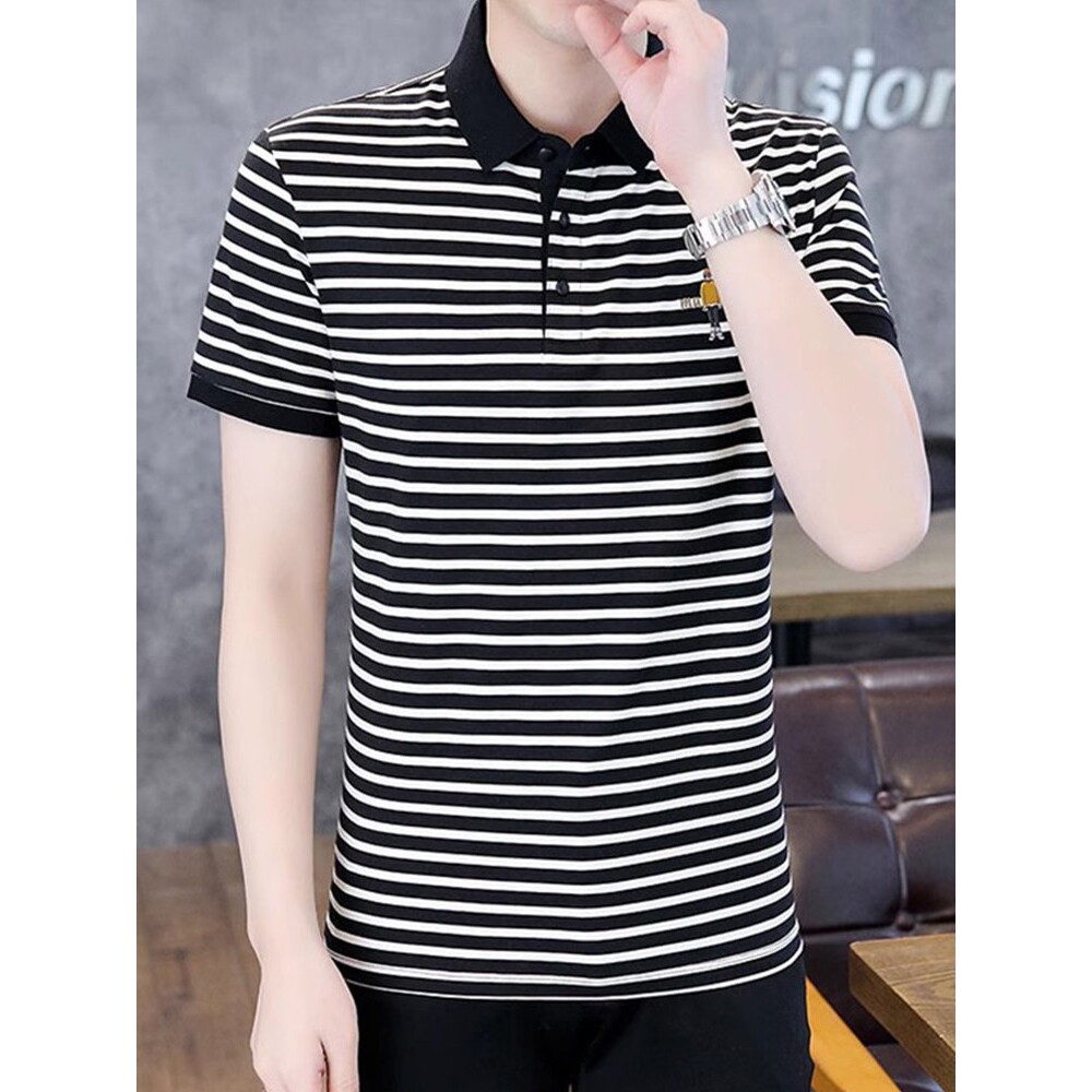 条纹衬衫男士短袖polo衫纯棉修身冰丝t恤夏季潮牌ins长袖衬衣潮流