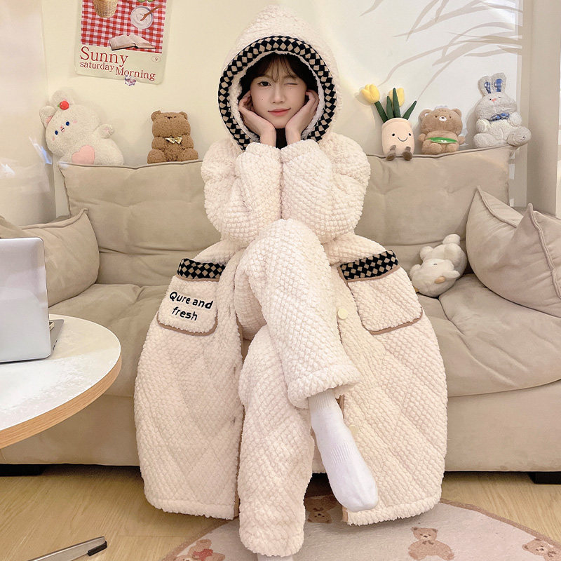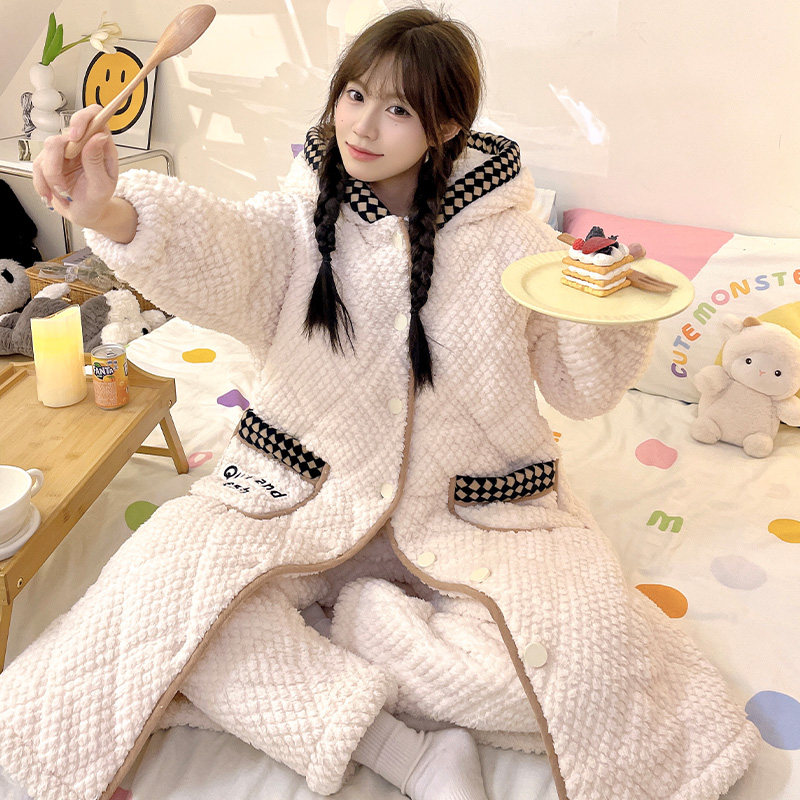 梦鸾珊瑚绒睡衣女款2025冬季三层夹棉加厚加绒睡袍长款家居服套装