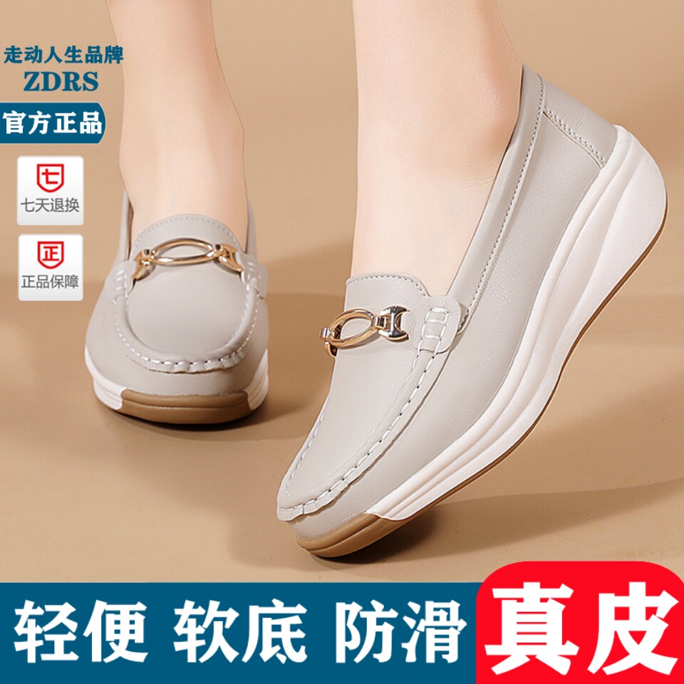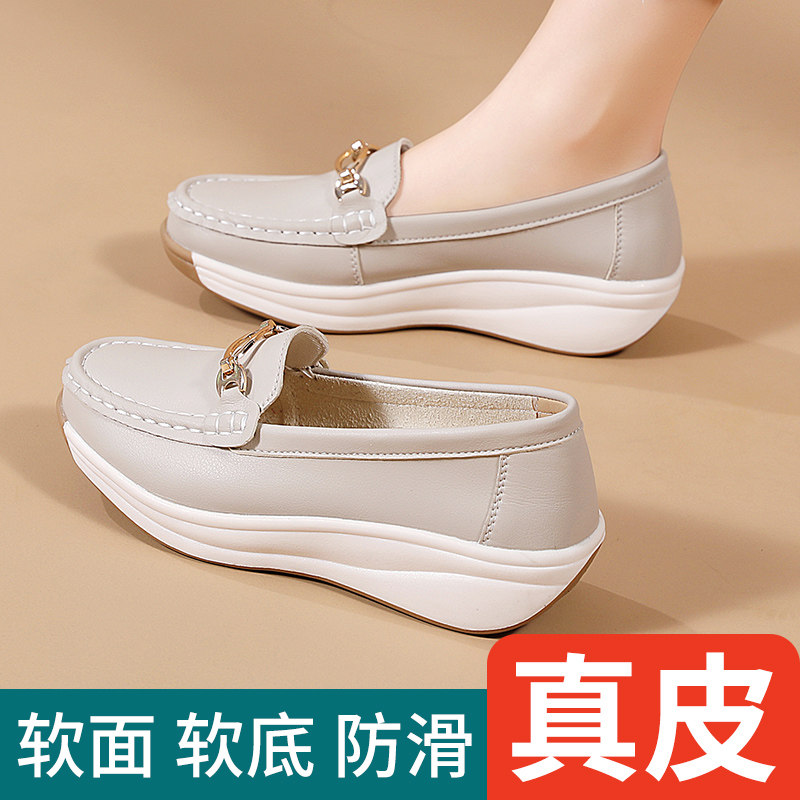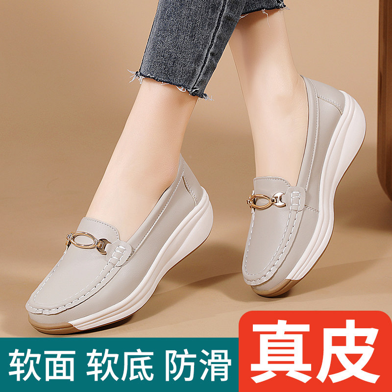 真皮小白鞋女鞋2026新款春季防滑软底单鞋厚底坡跟透气中年妈妈鞋