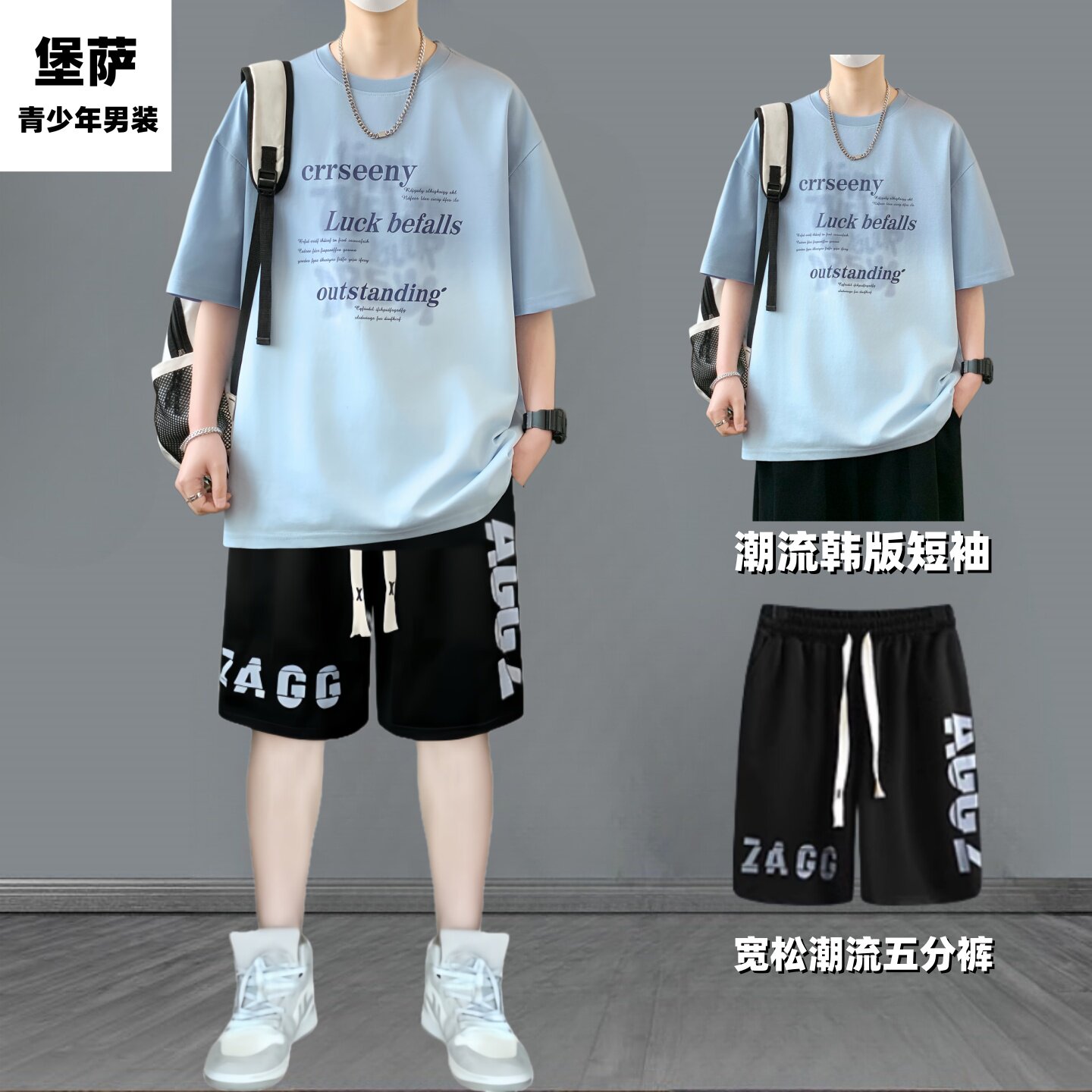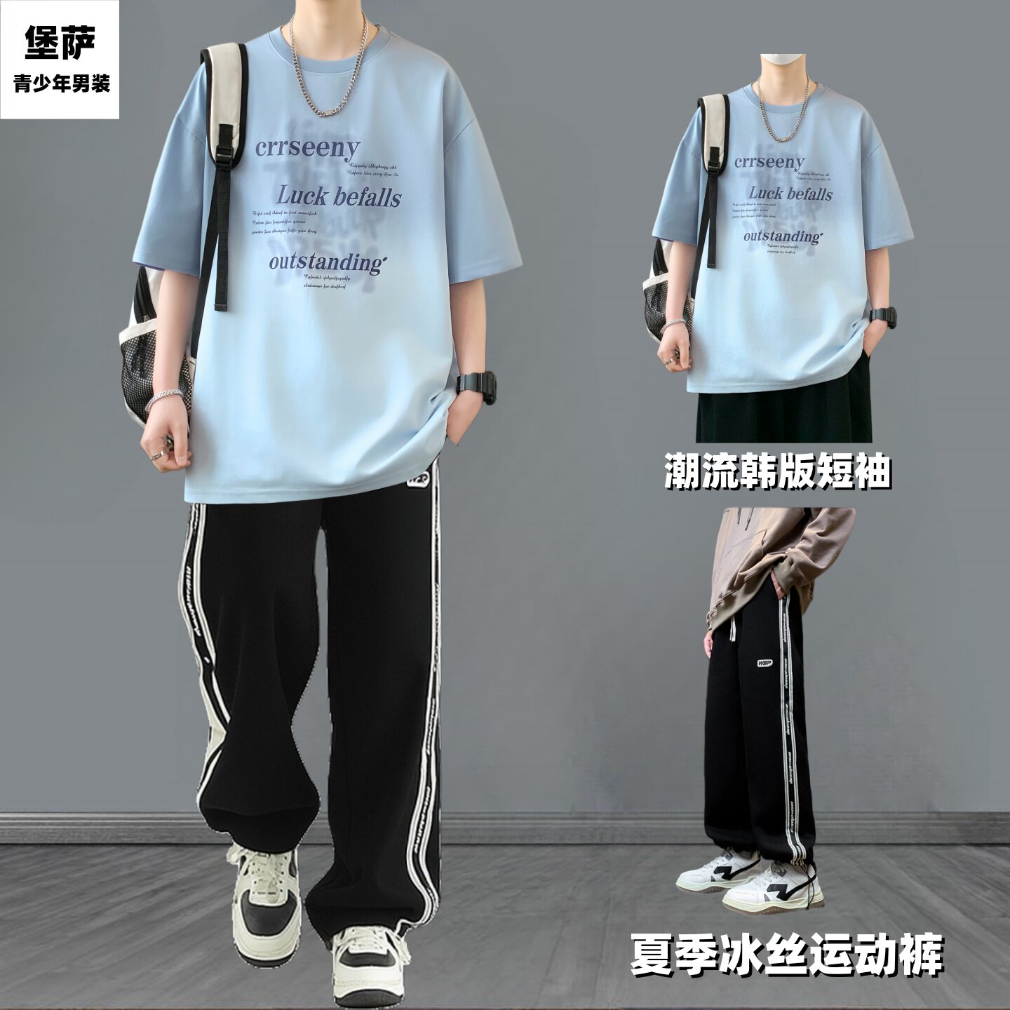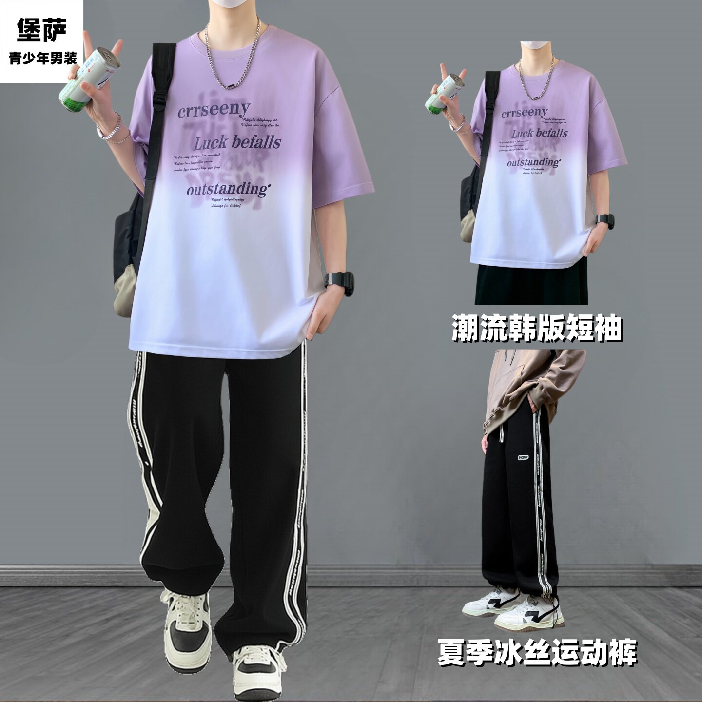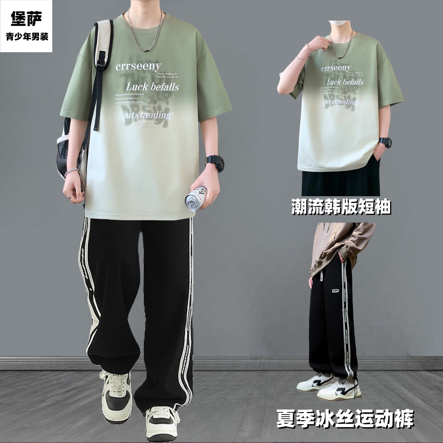 青少年渐变短袖T恤男夏季套装初高中生学生帅气冰丝运动裤半袖衫