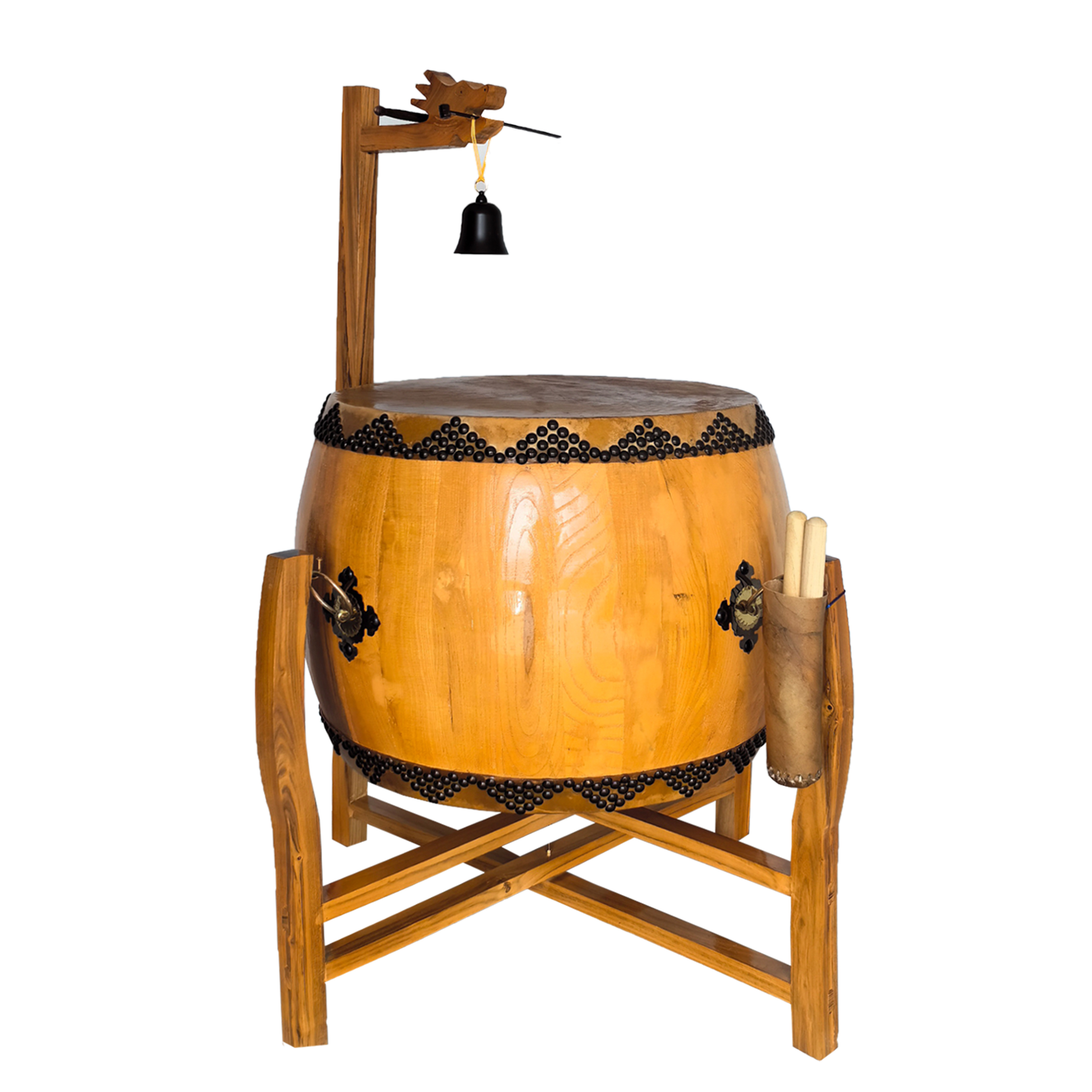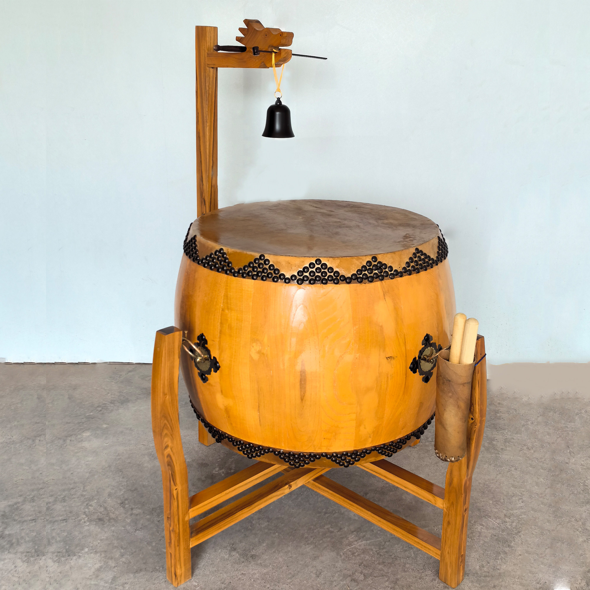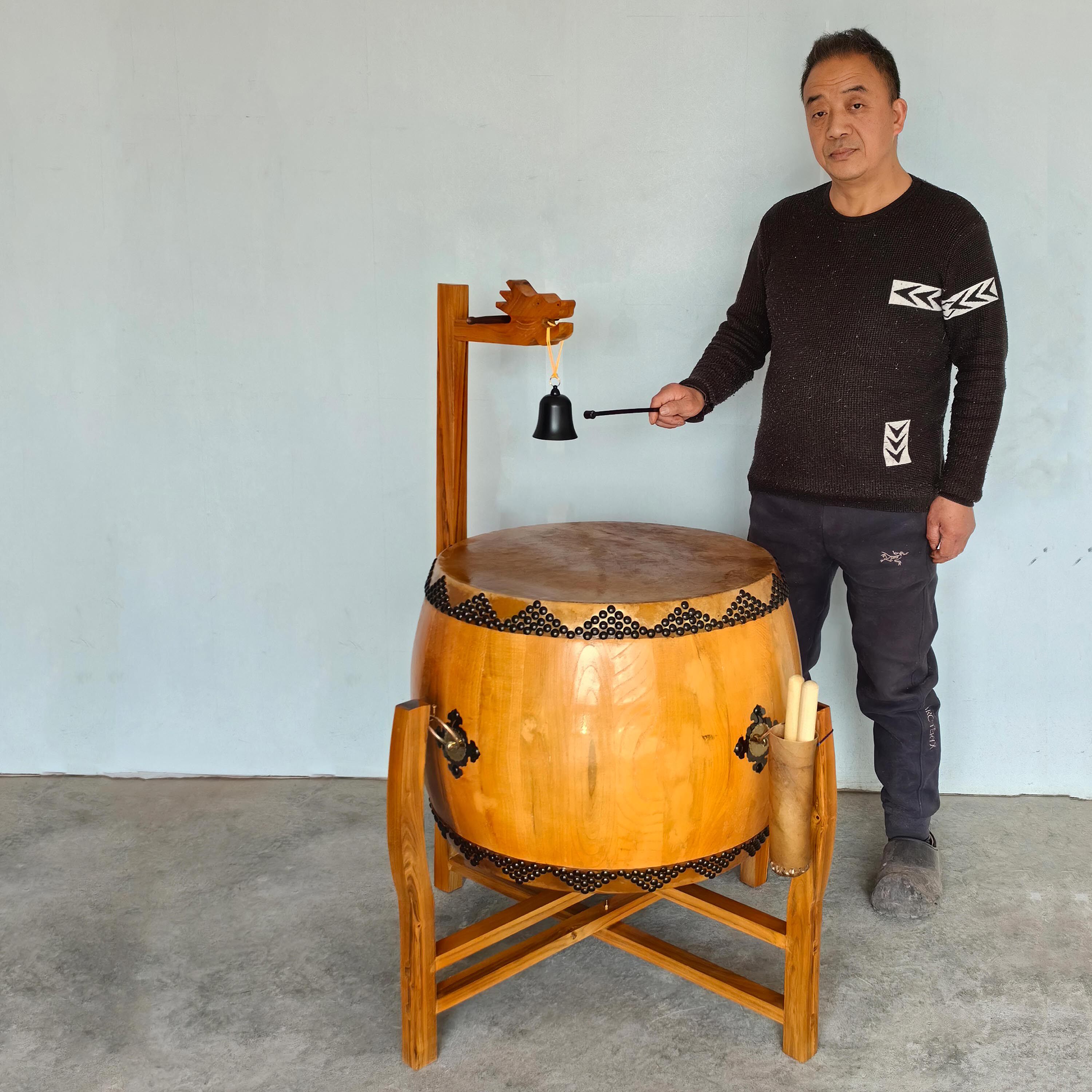 寺庙用鼓椿木黄牛皮铃钟鼓道场法器带帝钟实木鼓架诵经鼓佛具用品