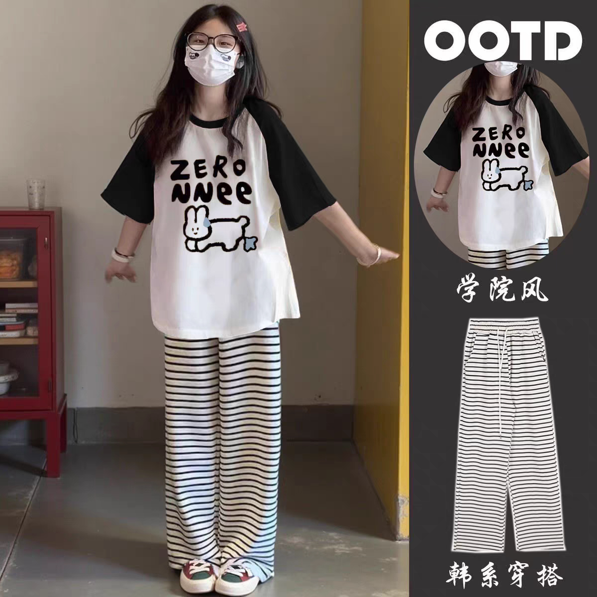 少女初中生套装女2026新款插肩t恤女夏短袖宽松阔腿裤薄款条纹裤