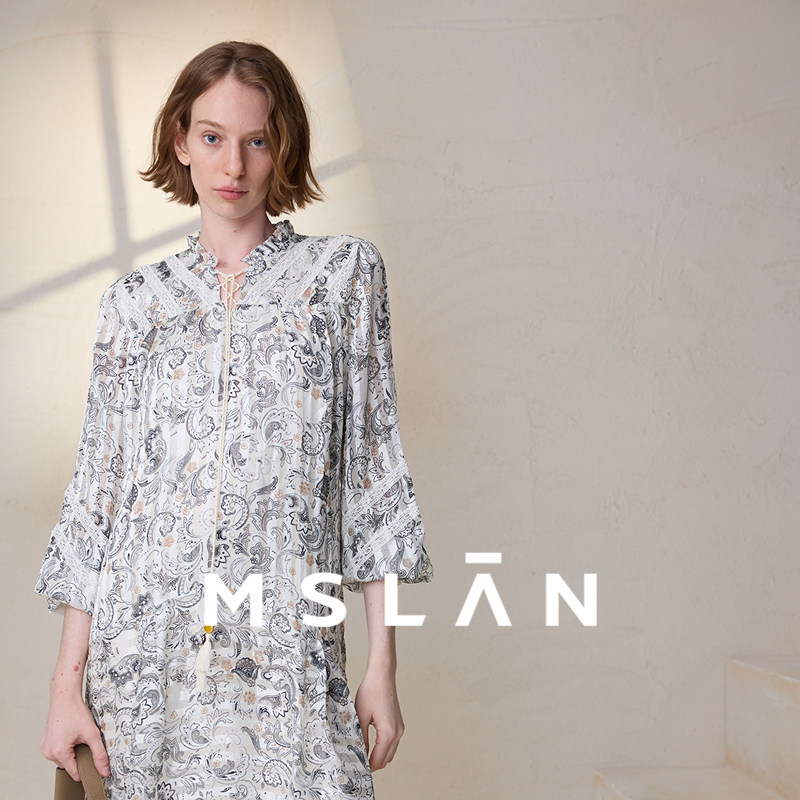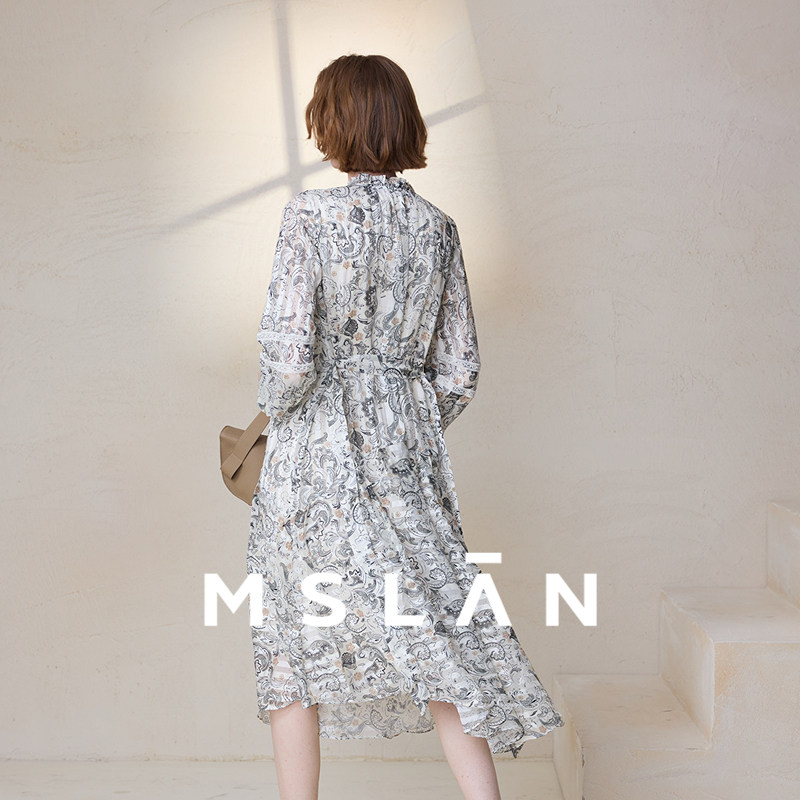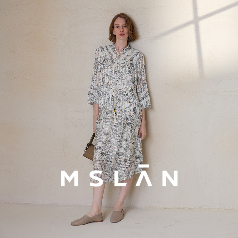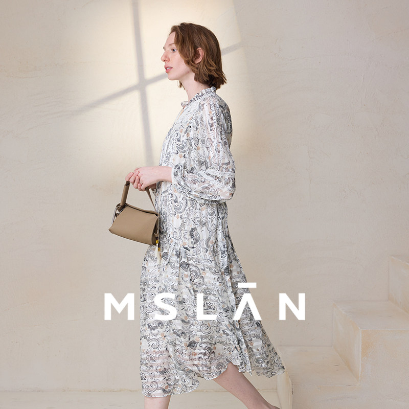 【垂坠飘逸】MSLAN春季法式老钱风印花长袖V领连衣裙MFAV4116