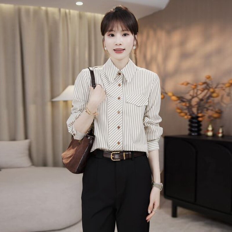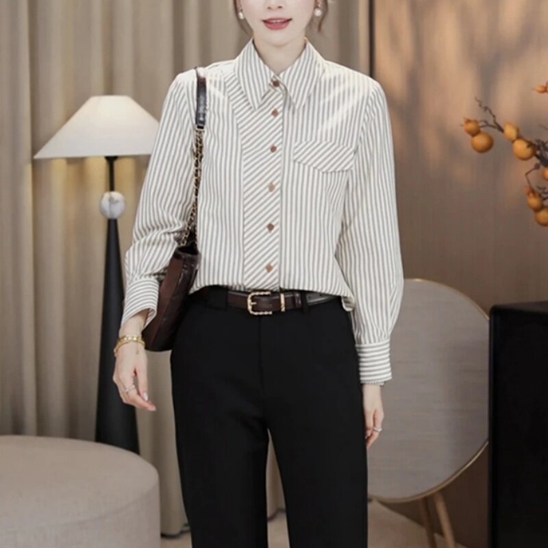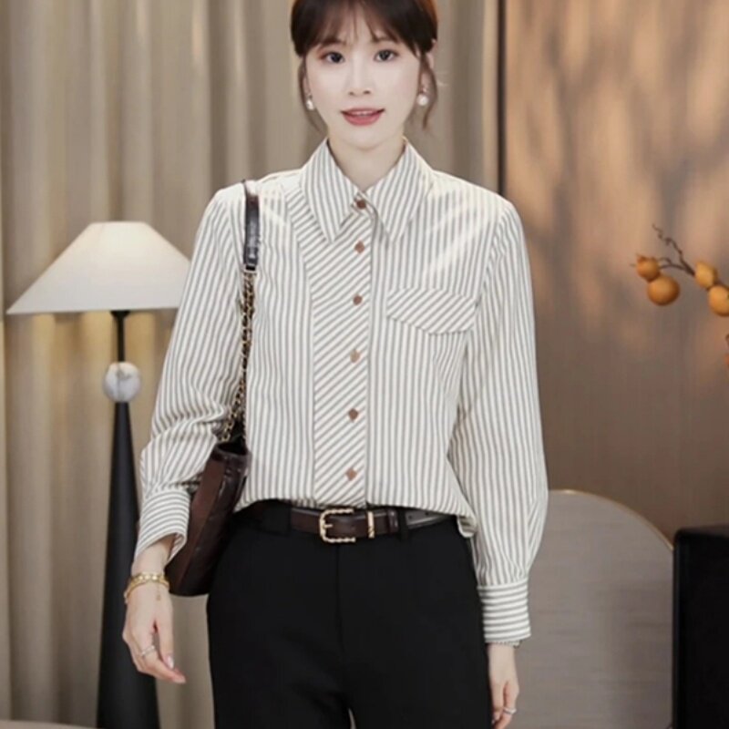 大码休闲百搭条纹衬衫女款2025新款秋季遮肚子显瘦单排扣长袖上衣