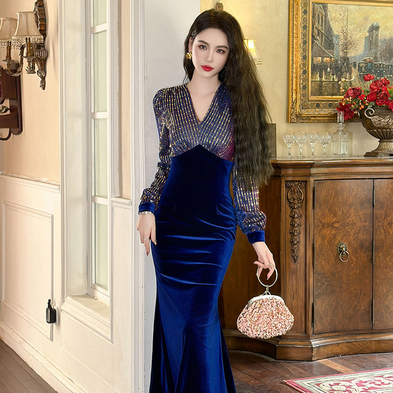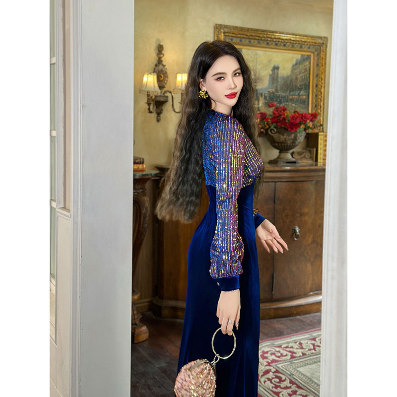 修身长袖丝绒鱼尾长裙轻奢高级感古风拼接亮片包臀内搭收腰连衣裙