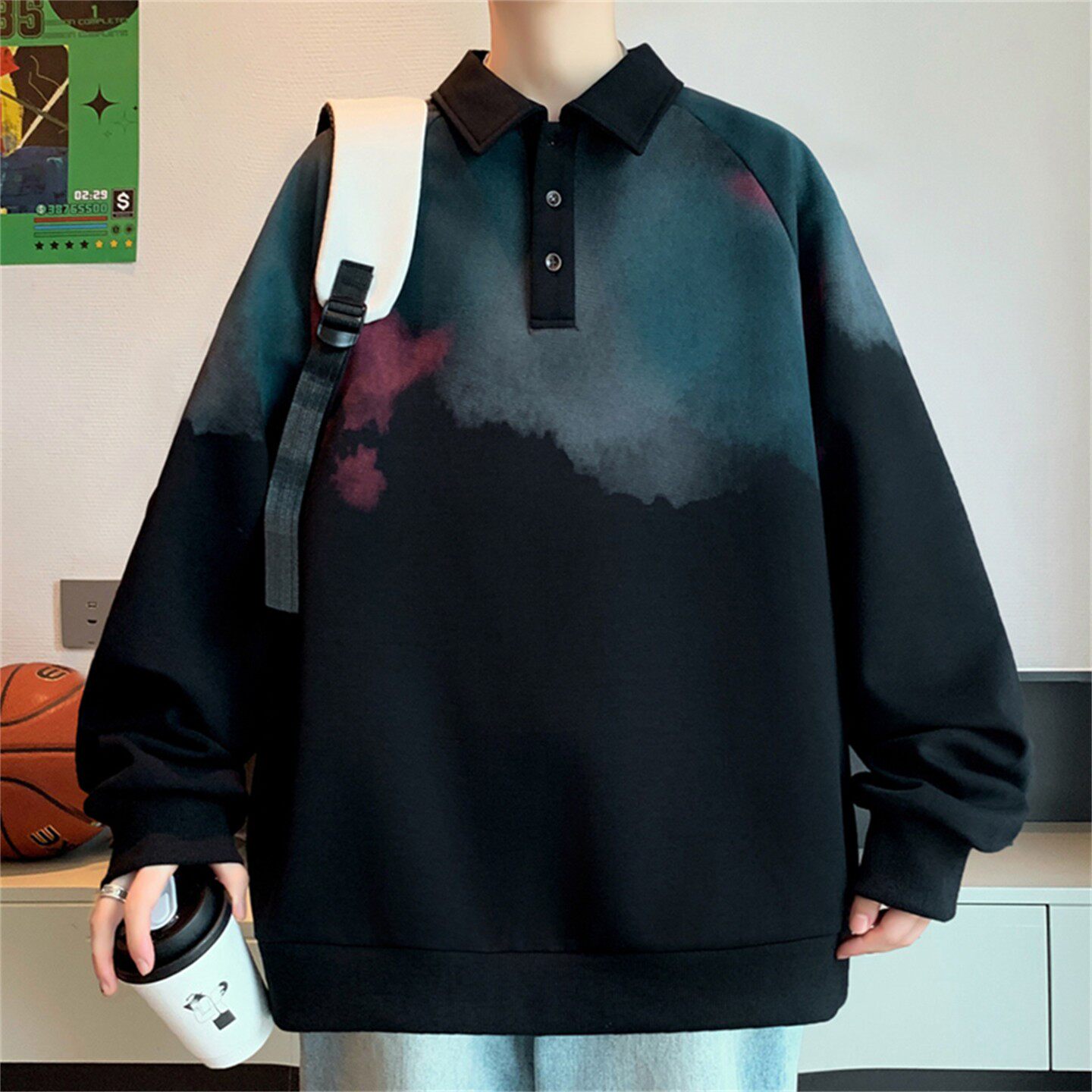 加绒渐变加厚翻领卫衣男生秋冬季潮流帅气百搭青少年保暖长袖上衣