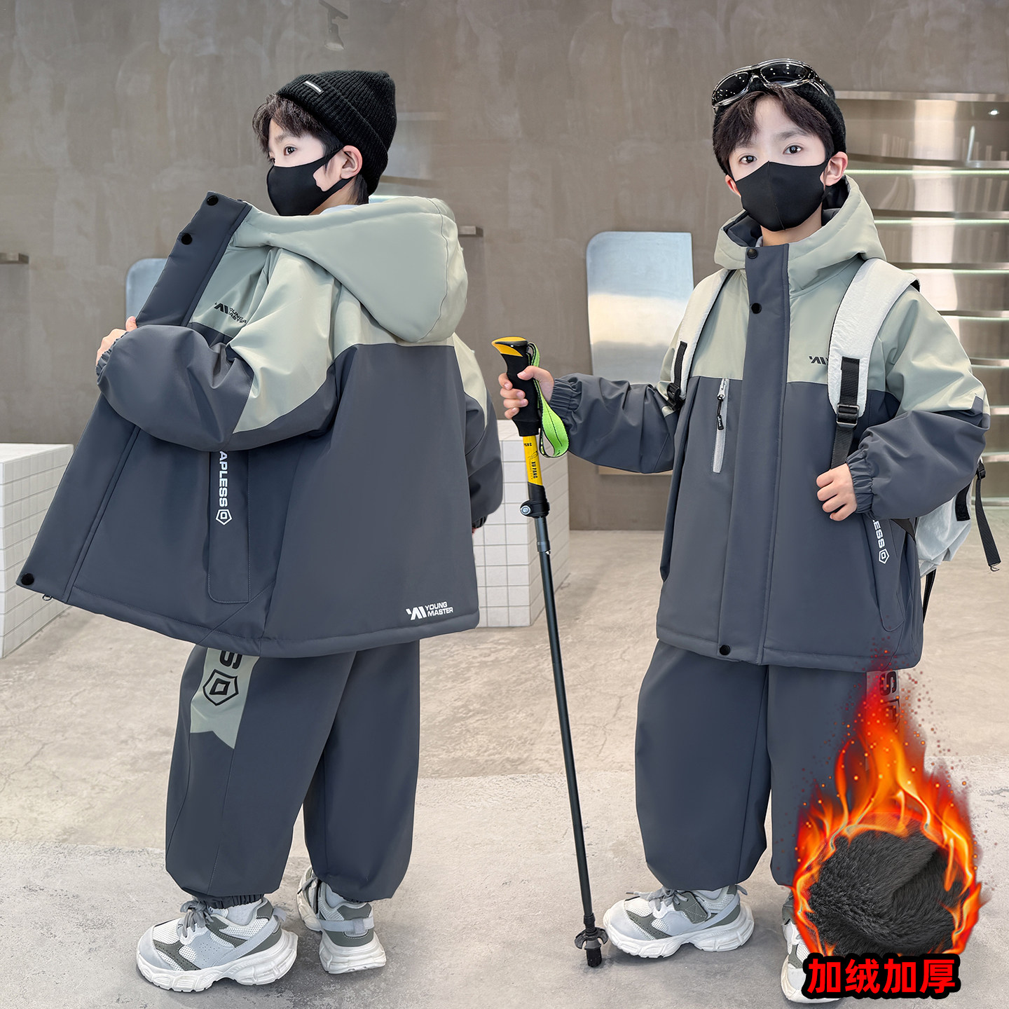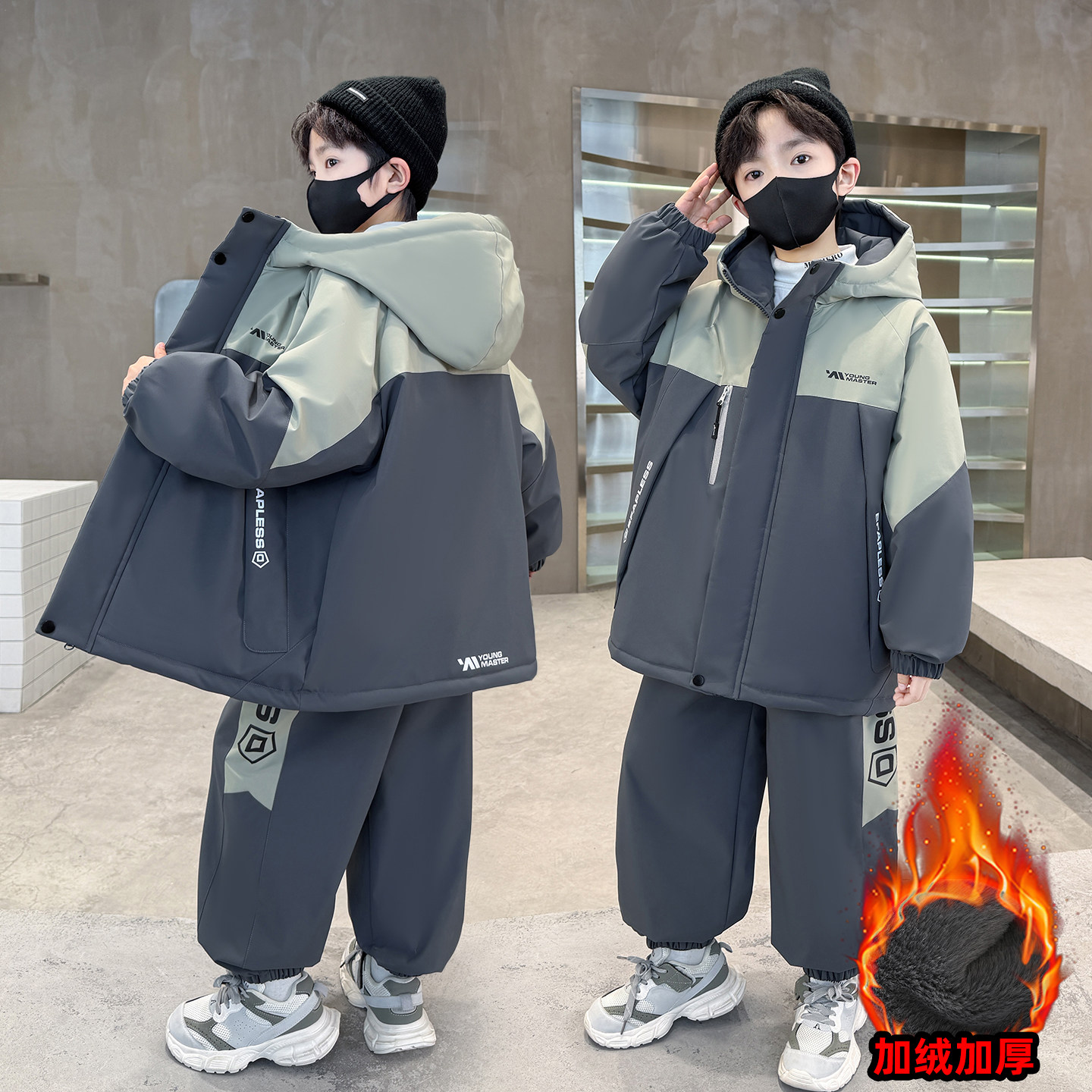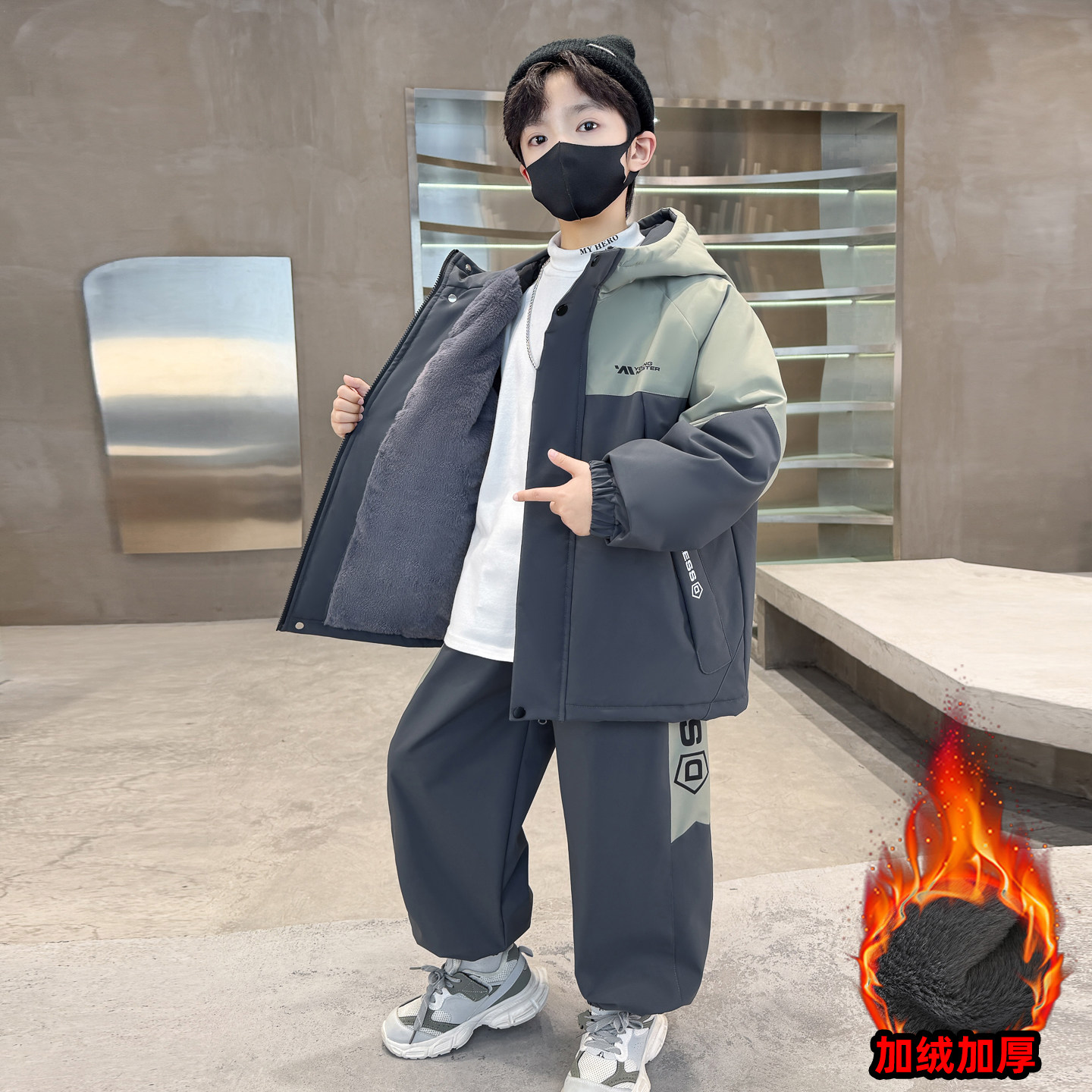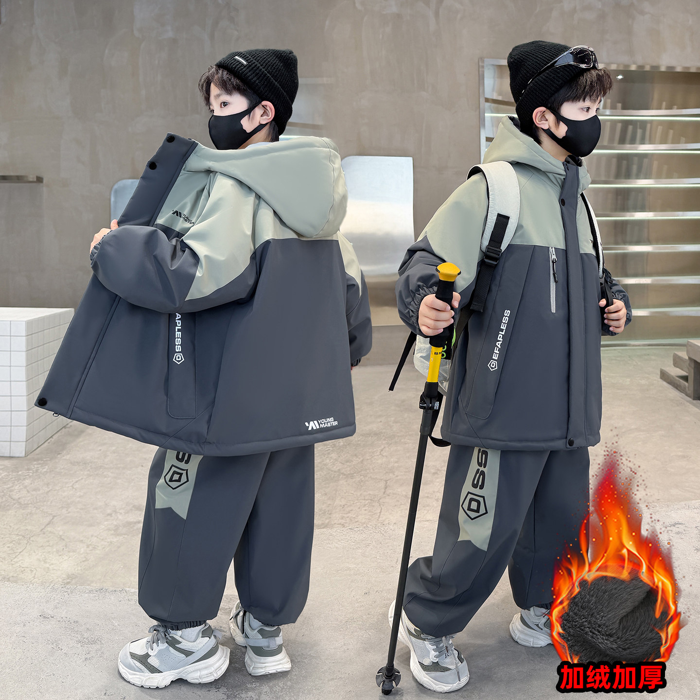 男童加绒套装秋冬装运动服2026新款中大童帅气男孩冬季加厚两件套