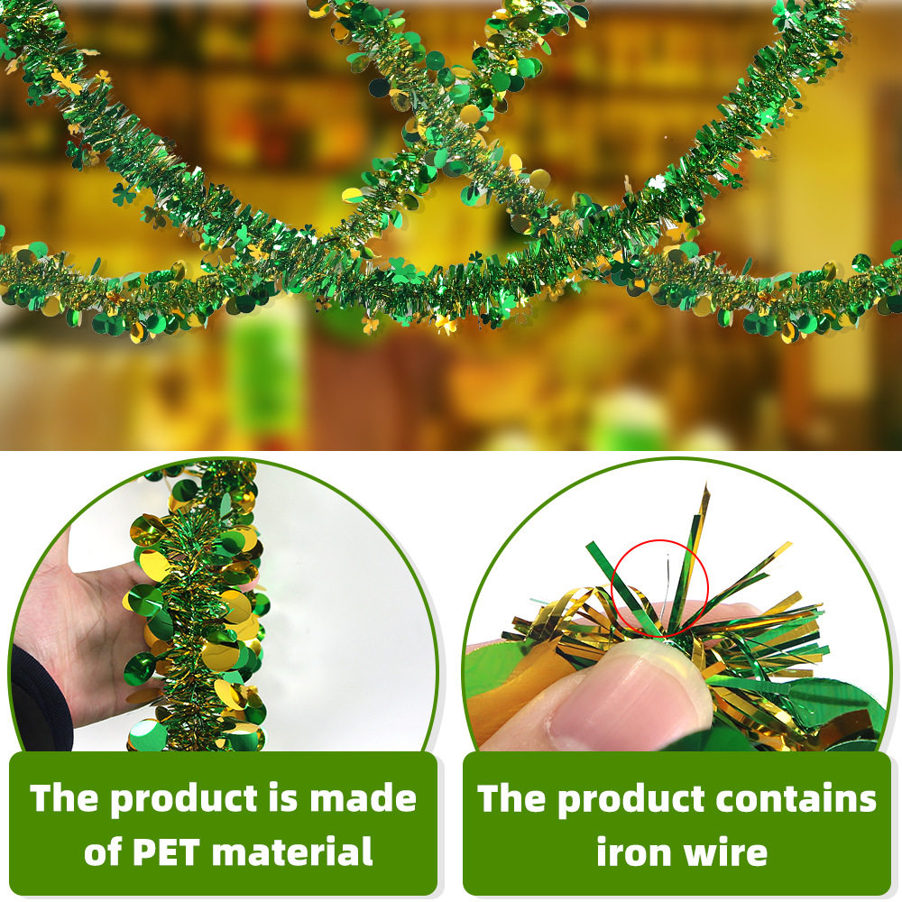 新款爱尔兰节拉花三叶草圆片金绿彩条圣帕特里克派对装饰毛条挂饰