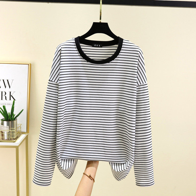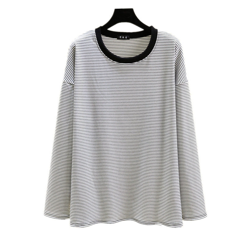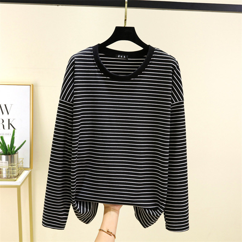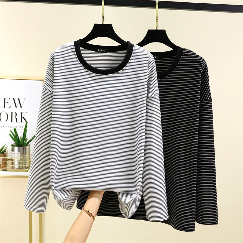 德绒秋冬季加厚宽松加绒长袖条纹T恤女可外穿大码上衣内搭打底衫