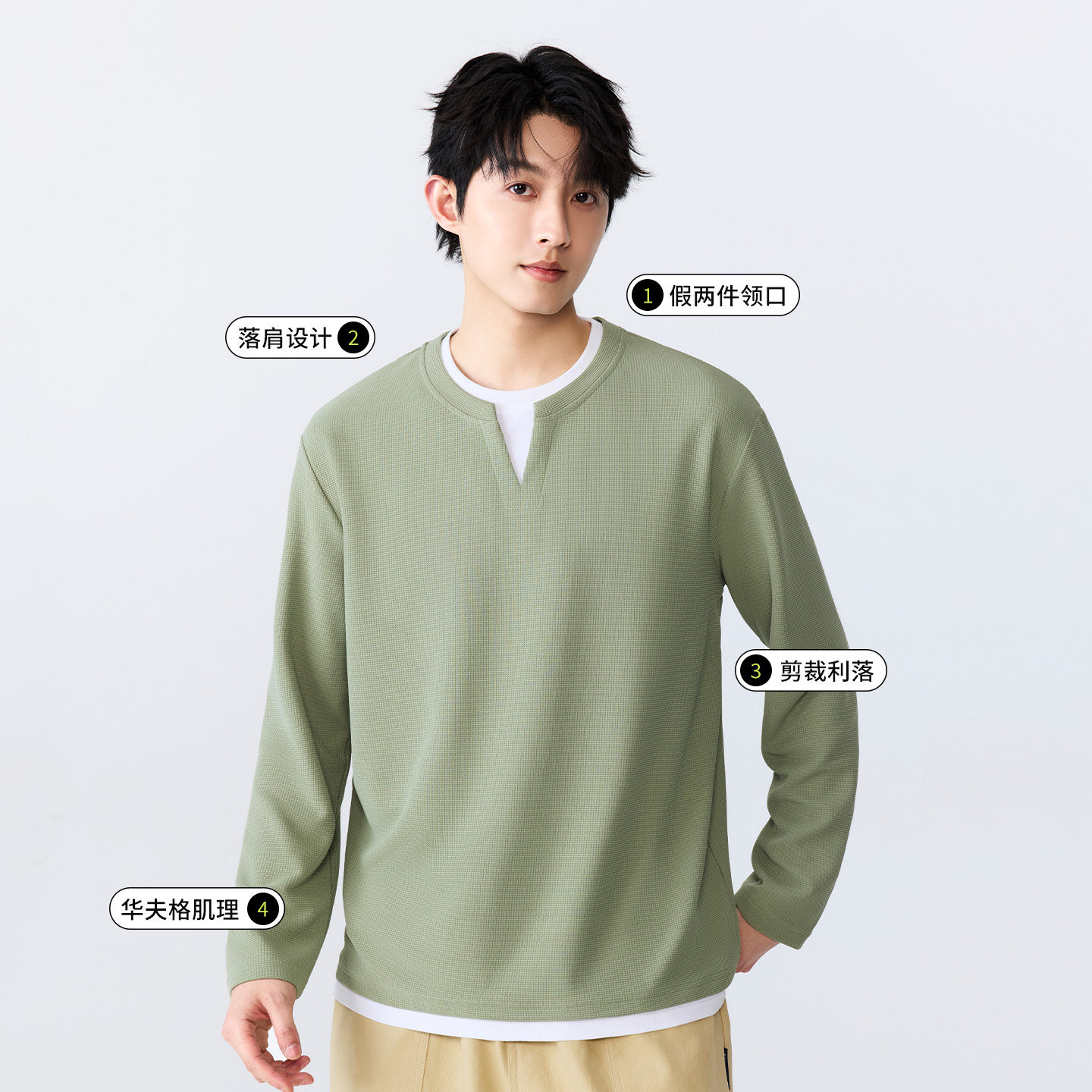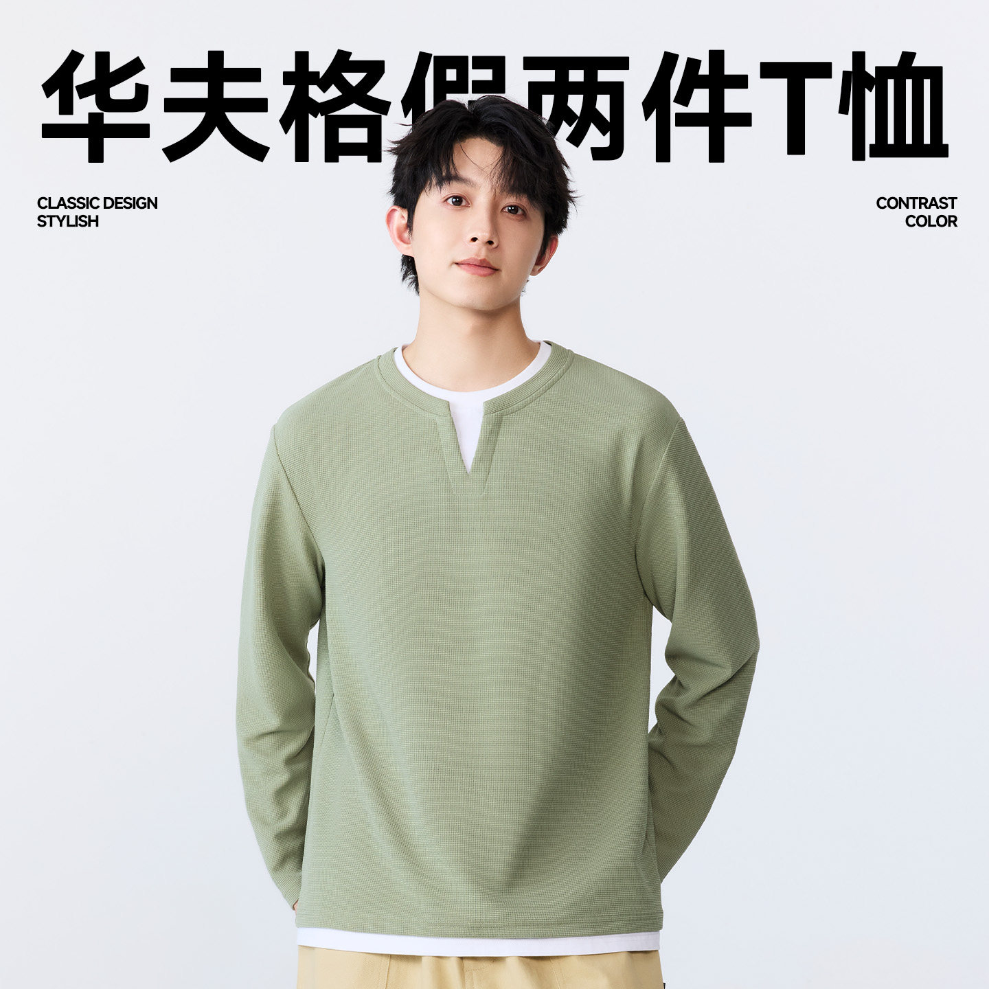 名创优品假两件长袖t恤男春秋内搭男款男装v领上衣华夫格打底衫A
