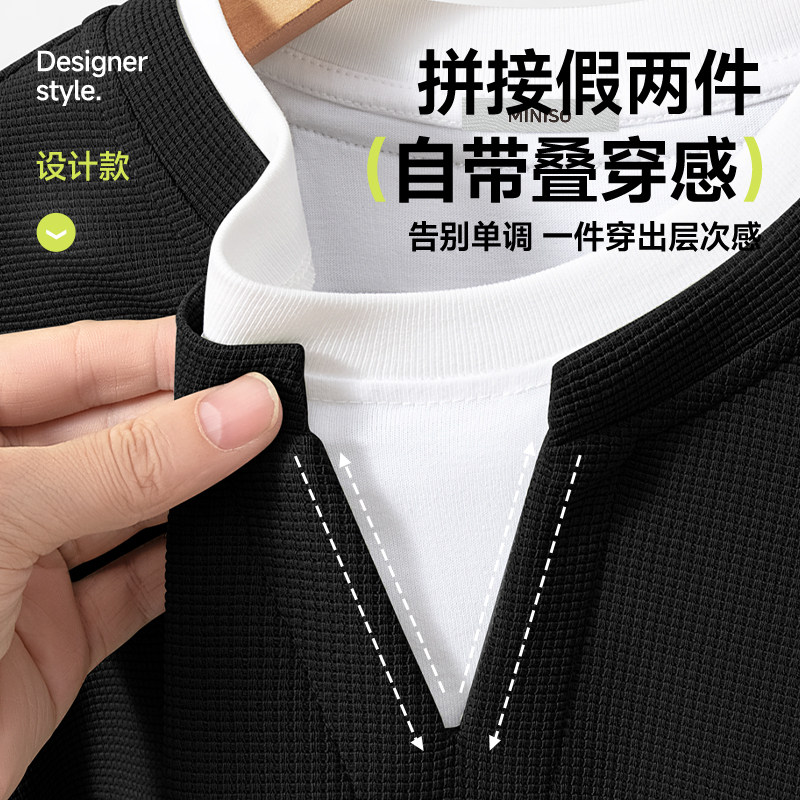 名创优品打底衫男款春季设计感华夫格假两件t恤大学生质感长袖男A