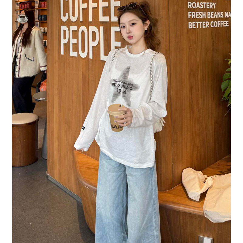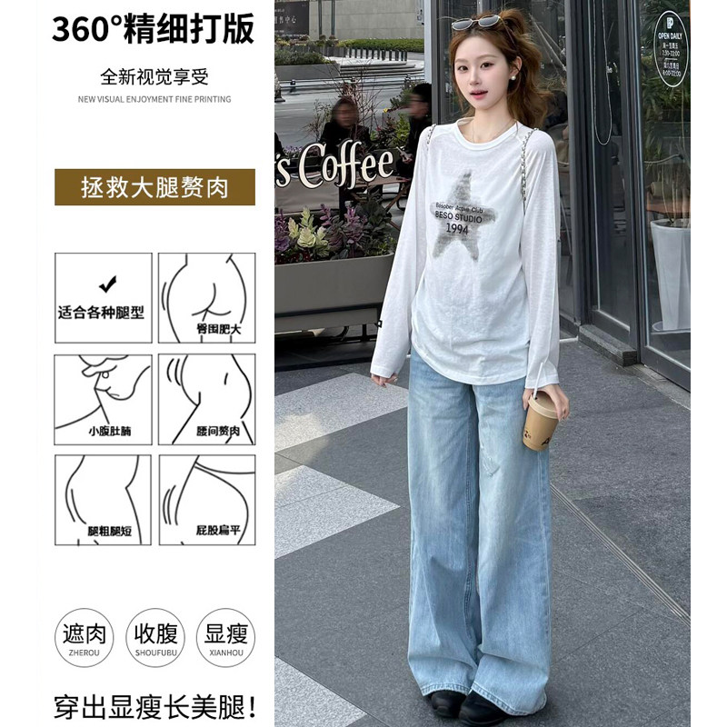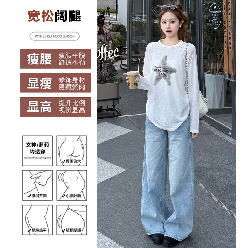 浅蓝色破洞阔腿牛仔裤女2026新款夏季薄款美式低腰水洗宽松直筒裤