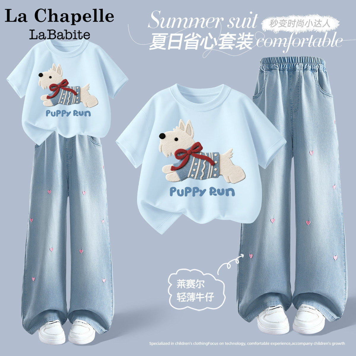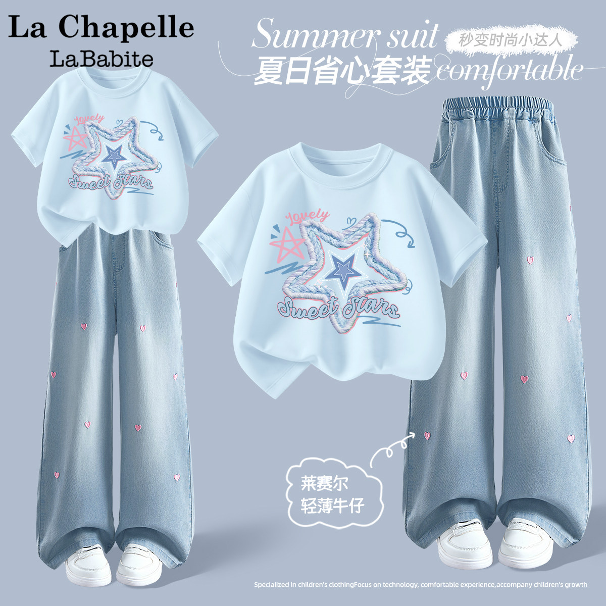 拉夏贝尔儿童短袖夏季套装2026新款中大童夏装童装t恤女童牛仔裤