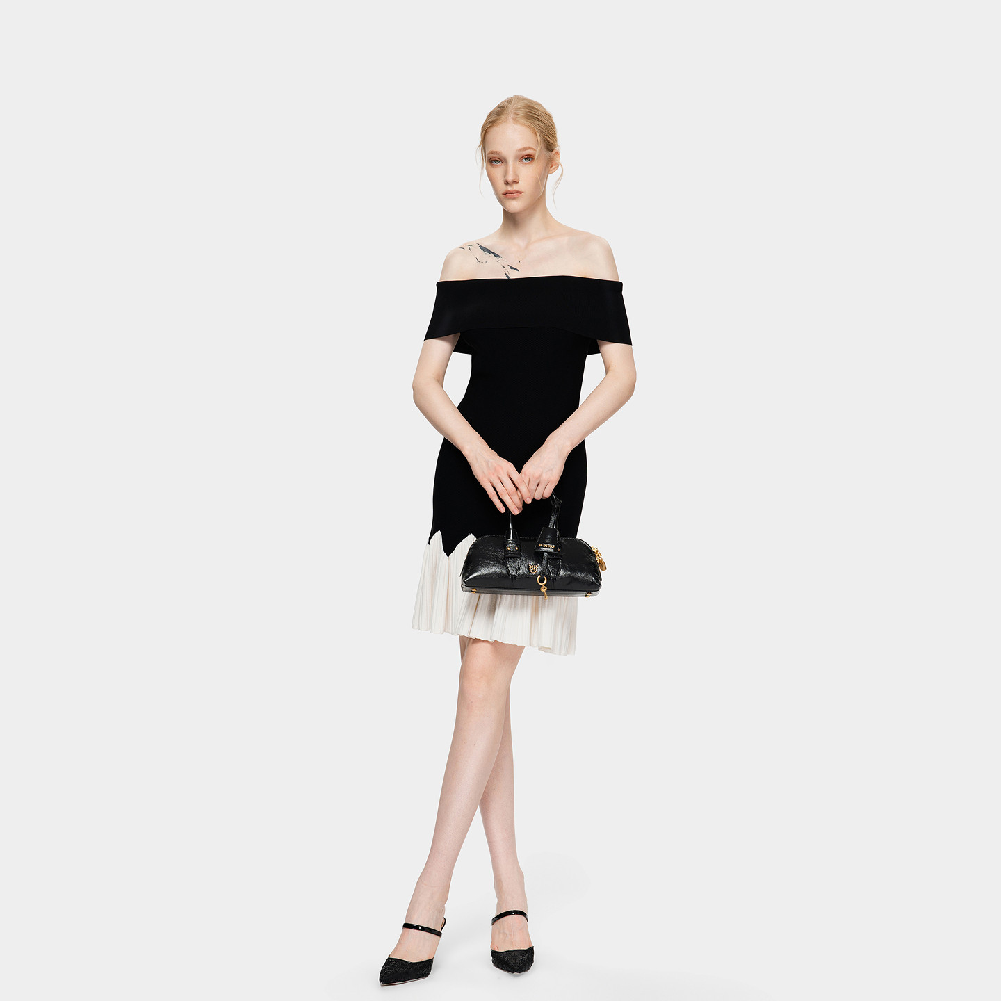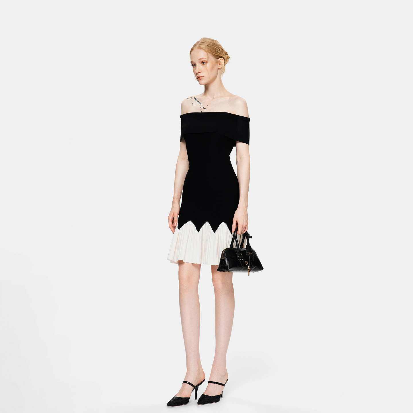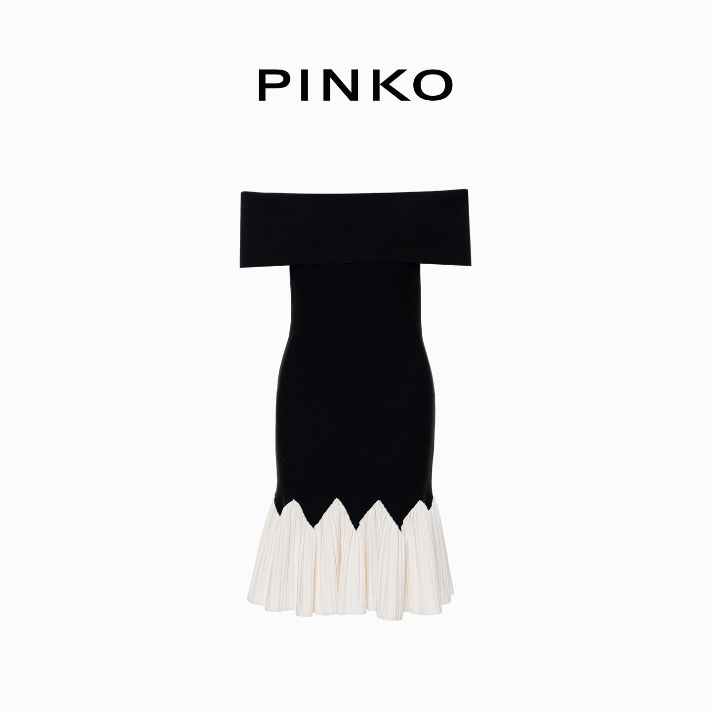 PINKO女士2026年春季新款一字肩波浪边紧身A摆连衣裙PAF26123842