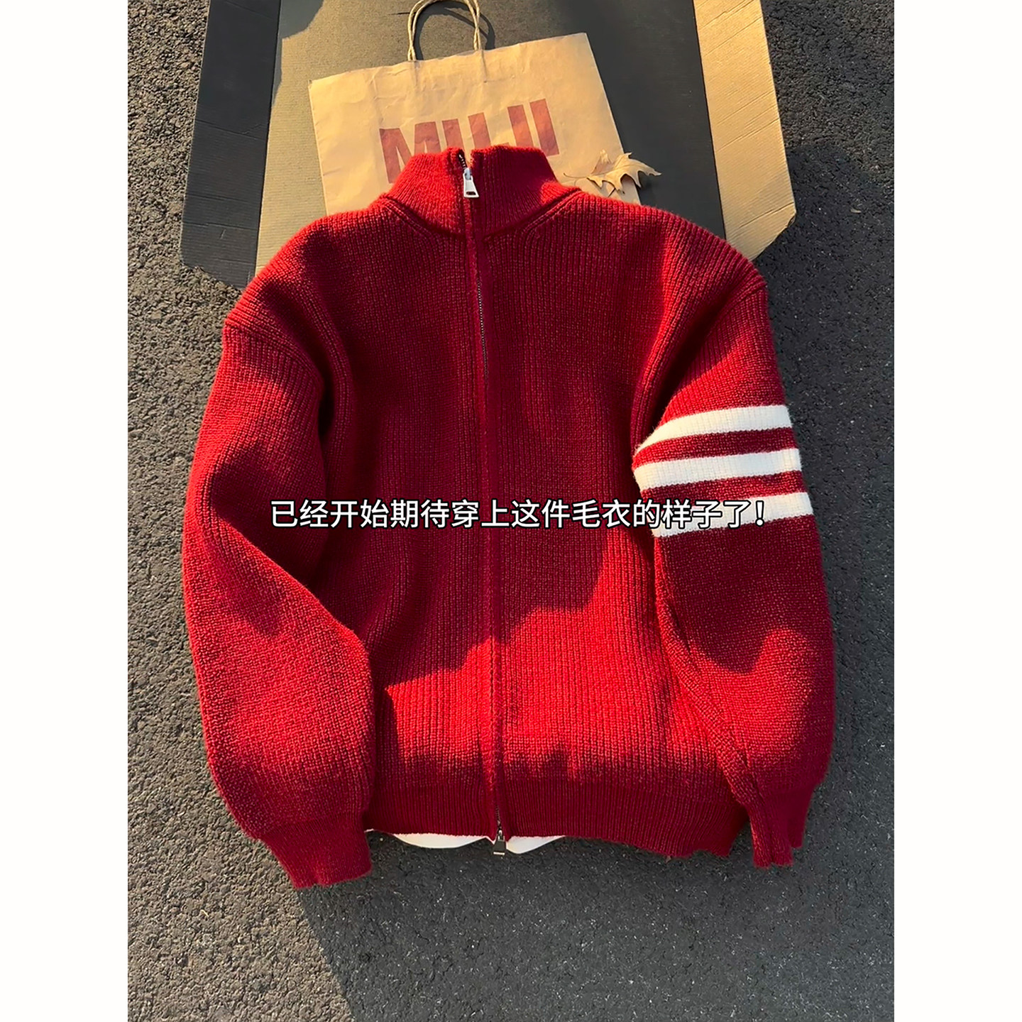 马年本命年红色开衫拉链毛衣男款冬季三条杠设计感情侣针织衫外套
