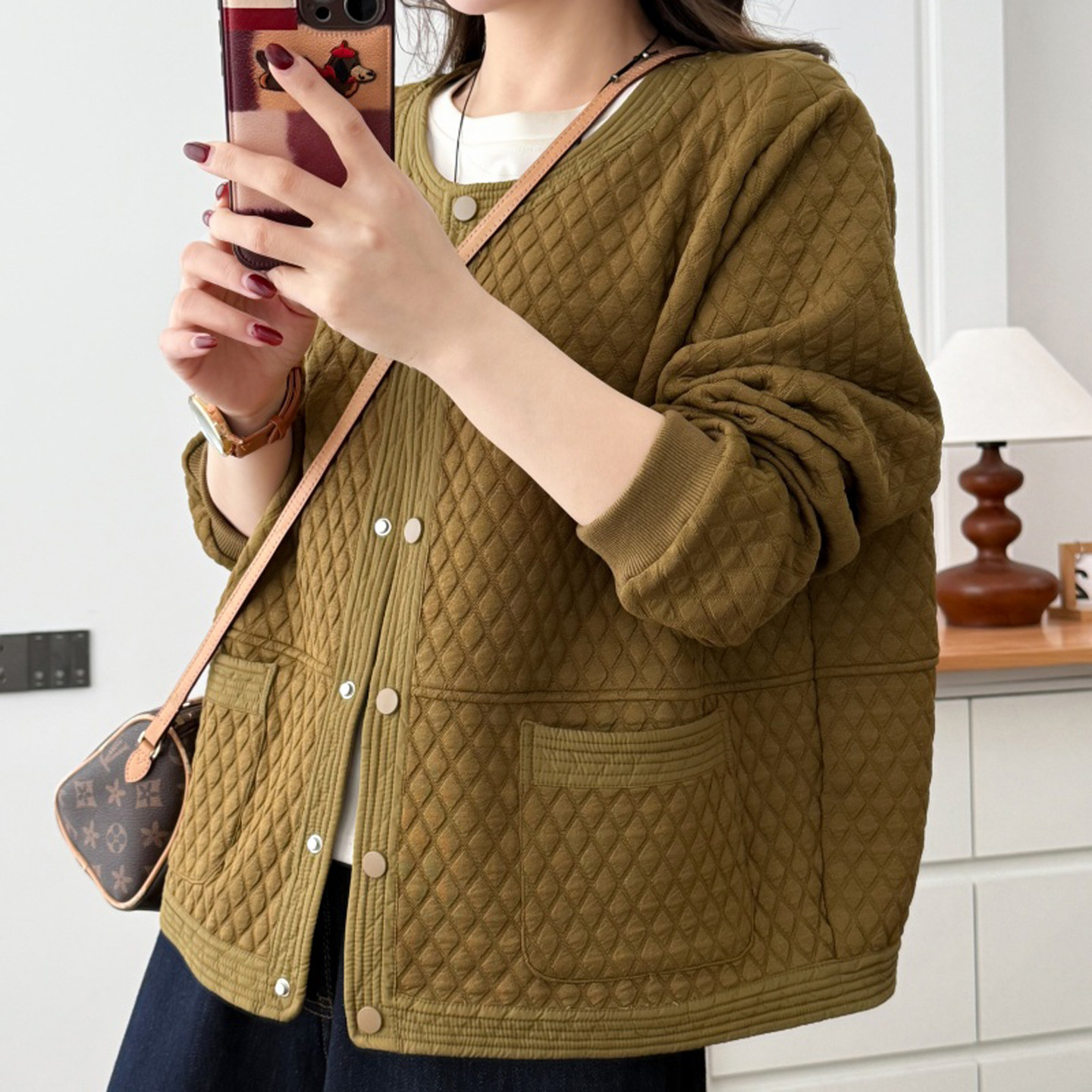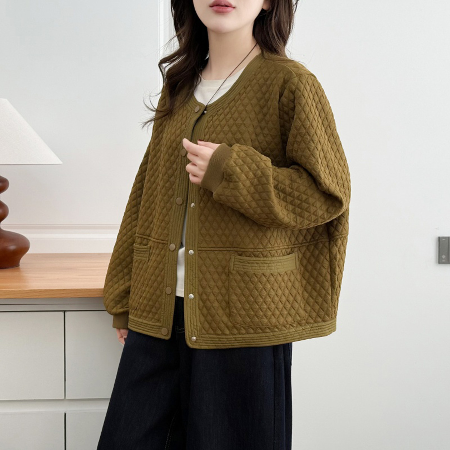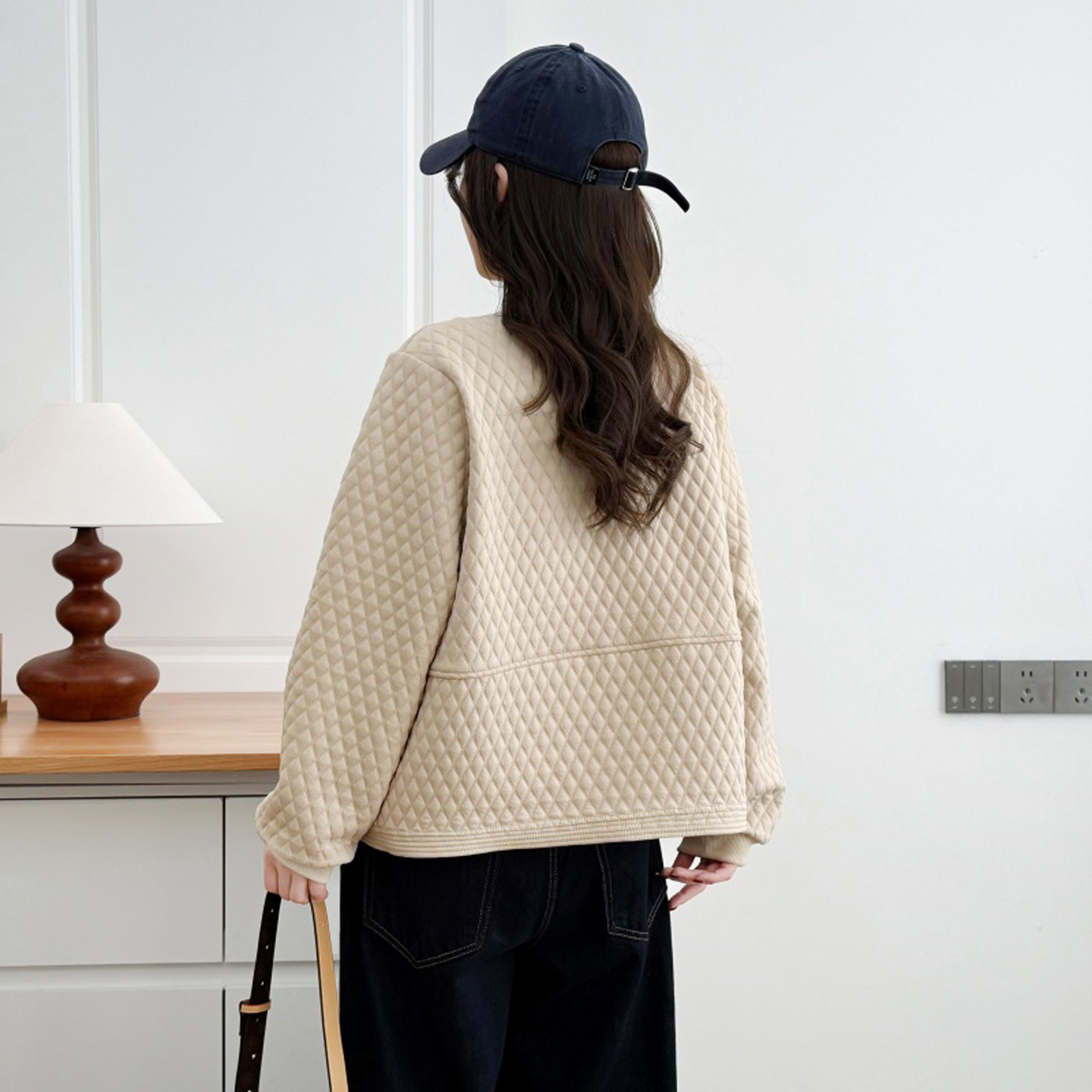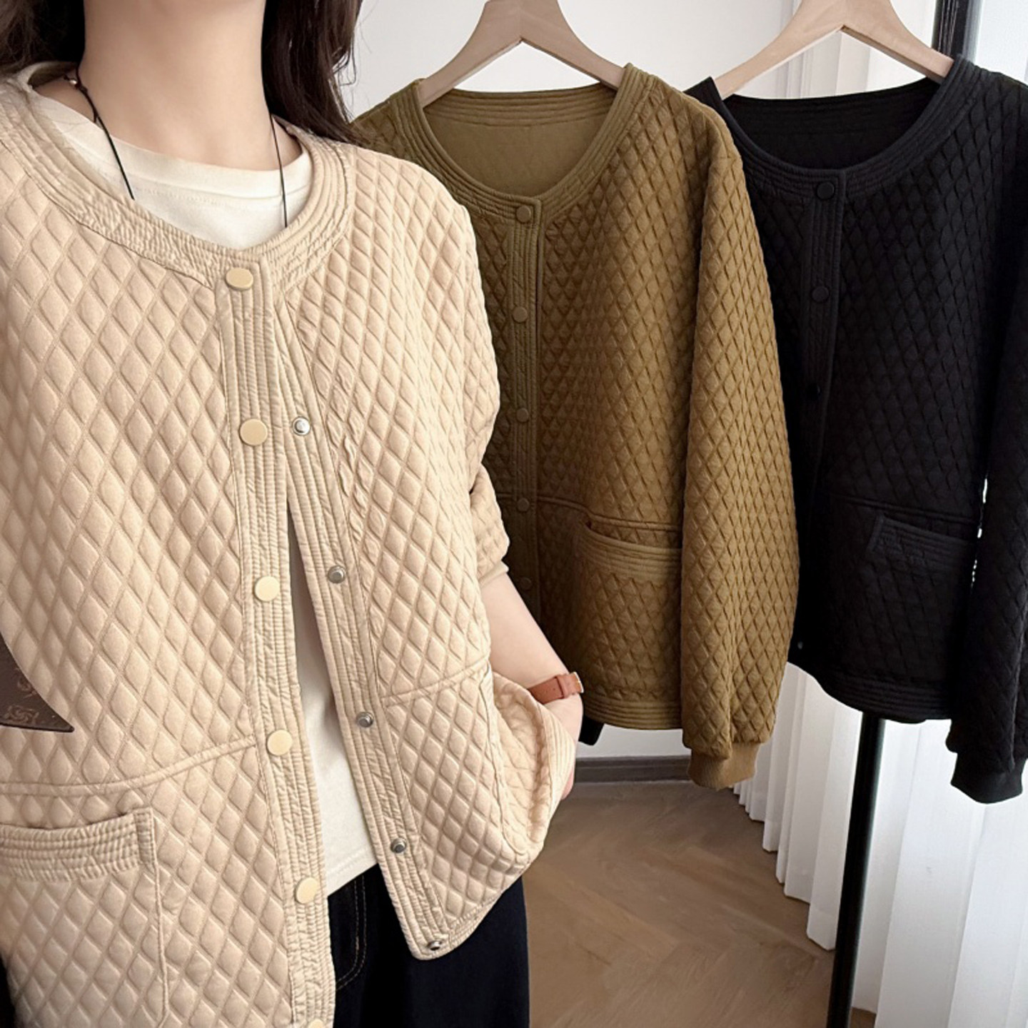 早春外套女大码宽松2026新款胖mm200斤韩版百搭圆领菱格休闲上衣