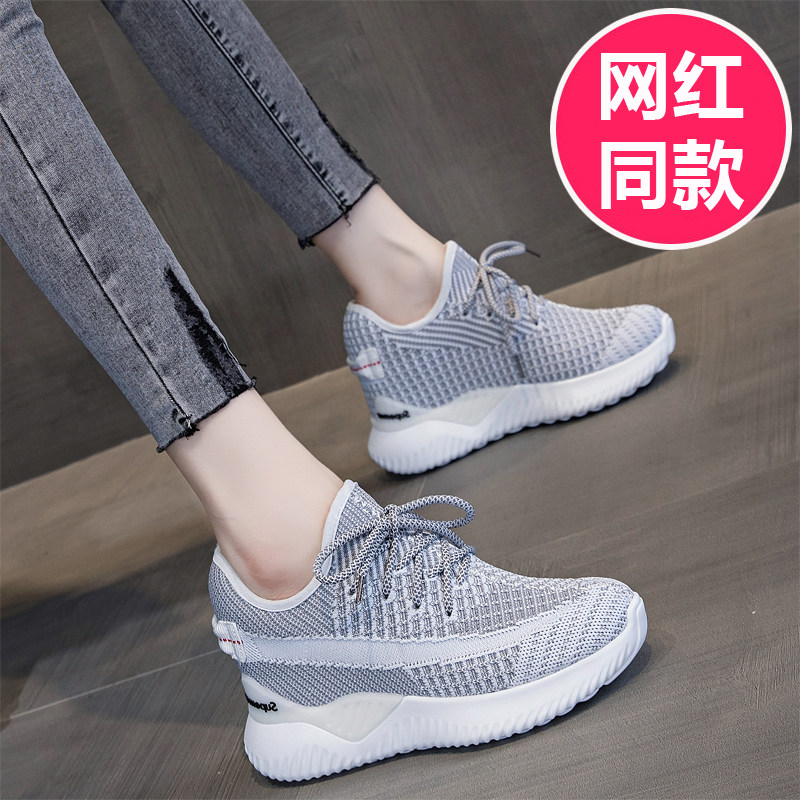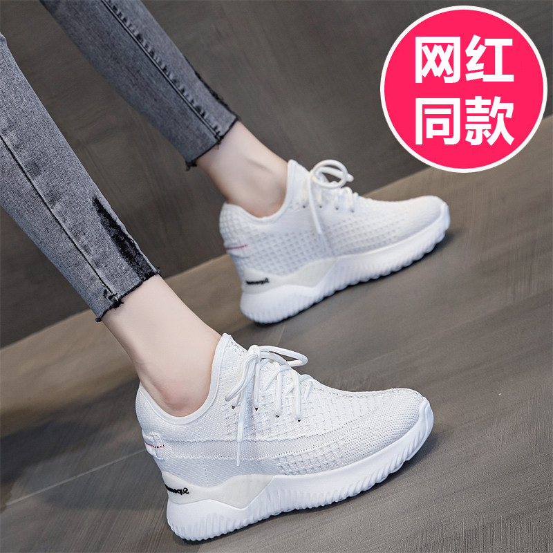 春季新款椰子鞋内增高女鞋运动鞋网面8CM厚底飞织小白鞋休闲透气