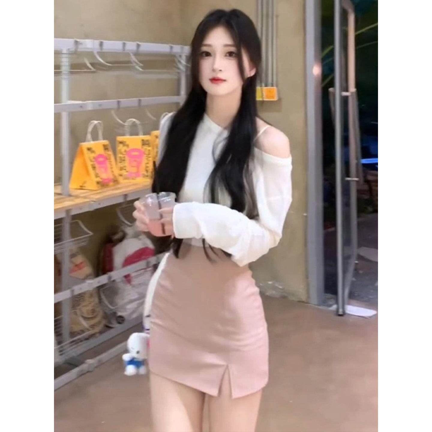 巨好看的早春一整套御姐风斜肩T恤肉粉色包臀短裙套装女2026新款