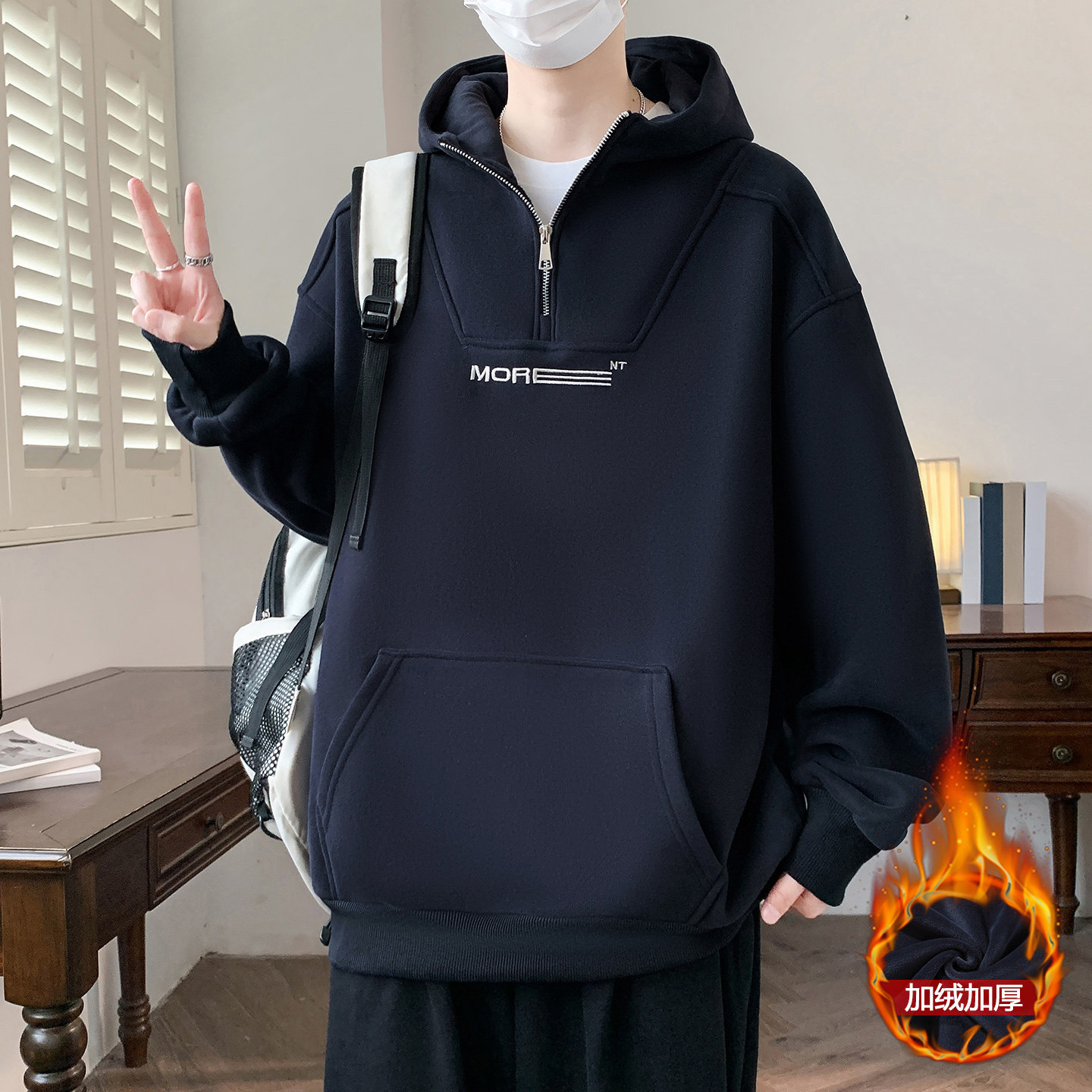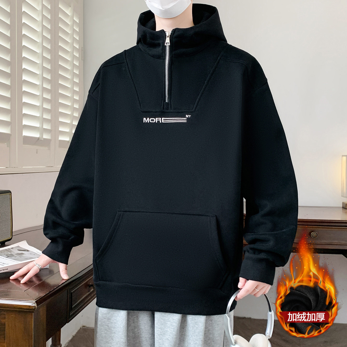 青少年秋冬款连帽卫衣男孩高中初中学生加绒加厚大童半拉链上衣服