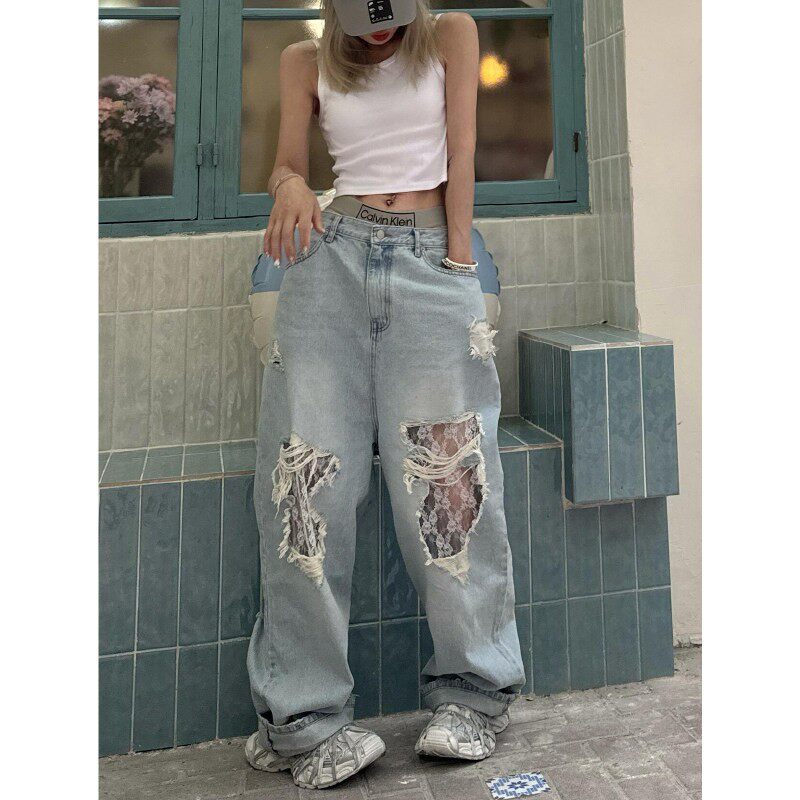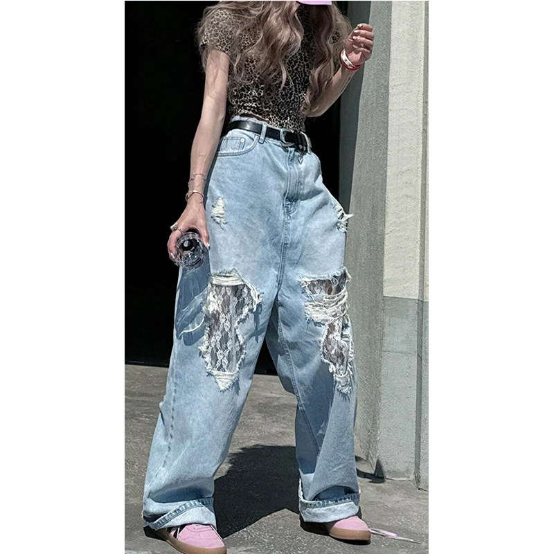 美式复古设计感蕾丝拼接破洞牛仔裤春季街头宽松显瘦阔腿裤子女款