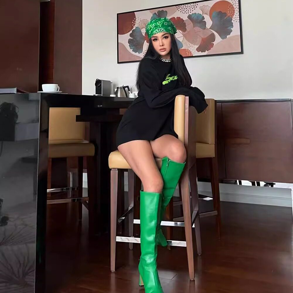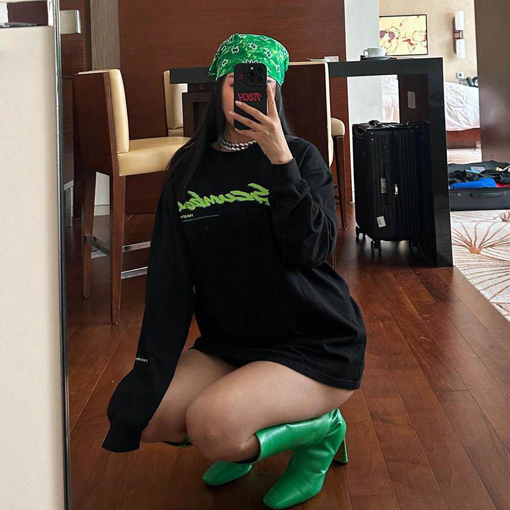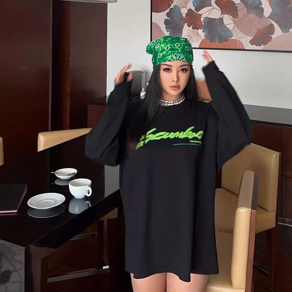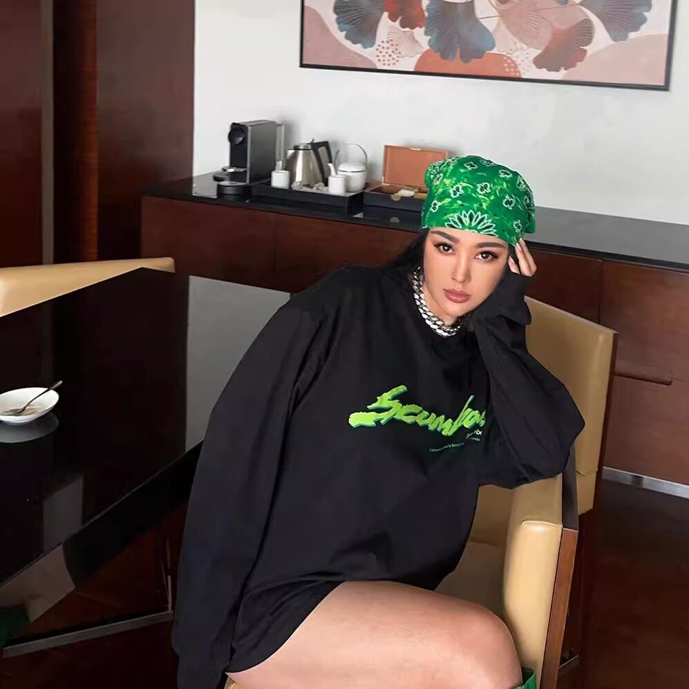 2024新款休闲宽松街头欧美黑色INS嘻哈潮人荧光绿字母圆领长袖T恤