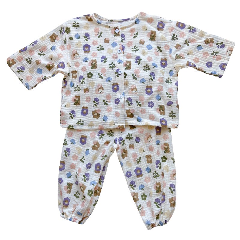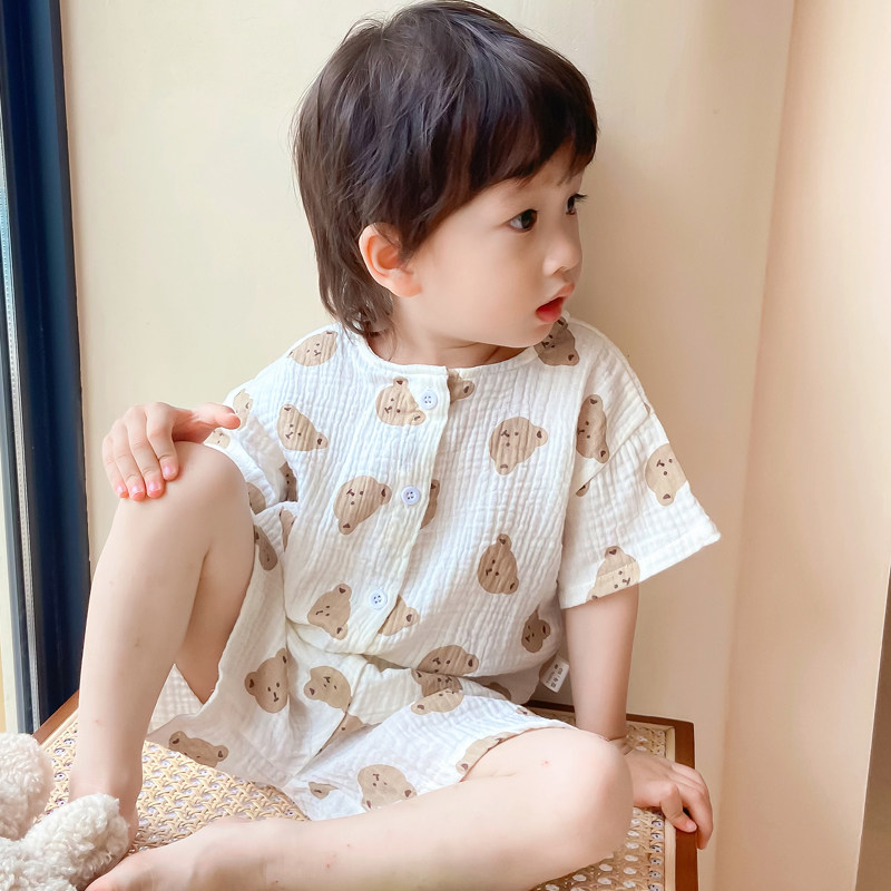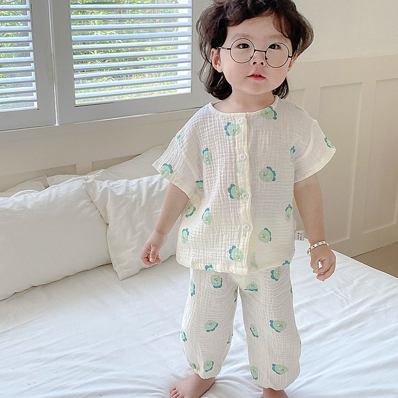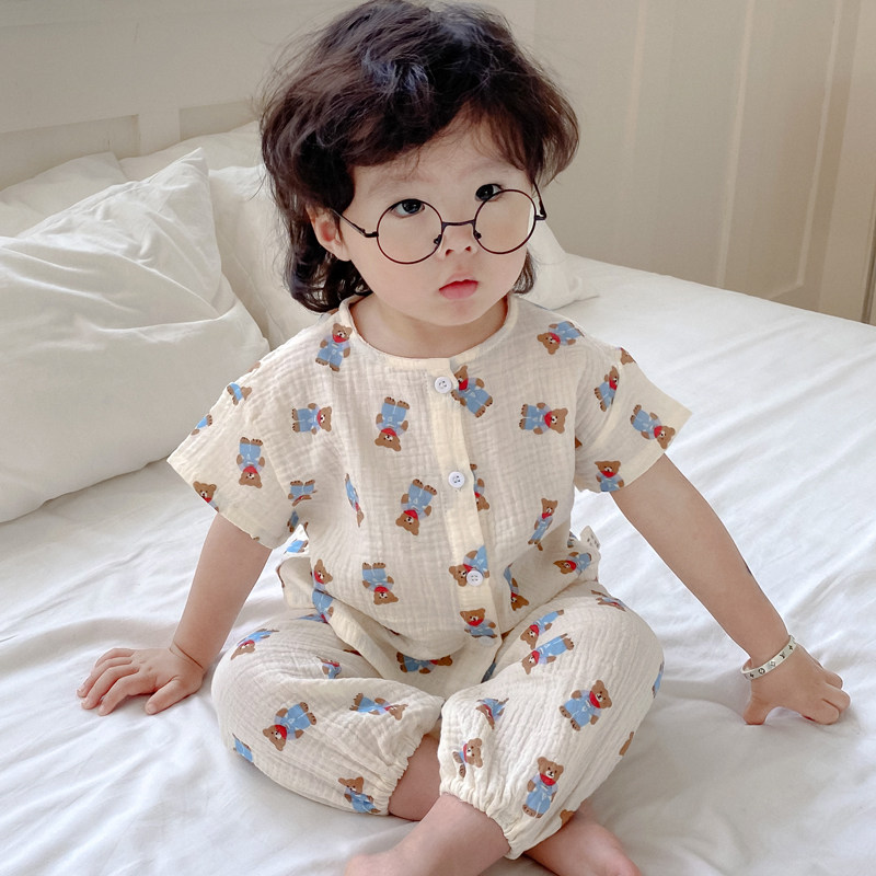 韩国宝宝家居服纯棉薄款短袖棉麻套装夏季儿童睡衣男童女孩小童装
