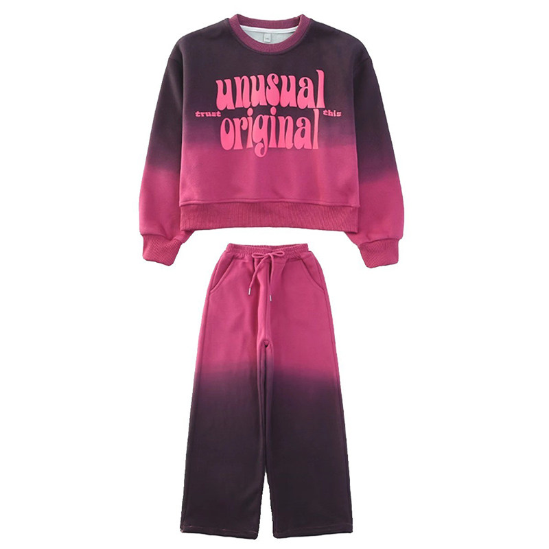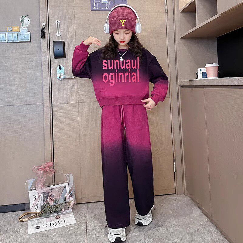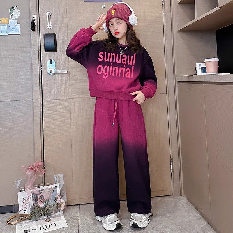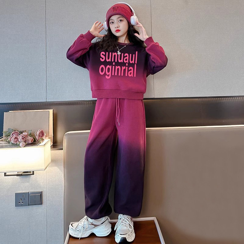 女童加绒套装2026中大童新款秋冬洋气儿童渐变色卫衣两件套紫色