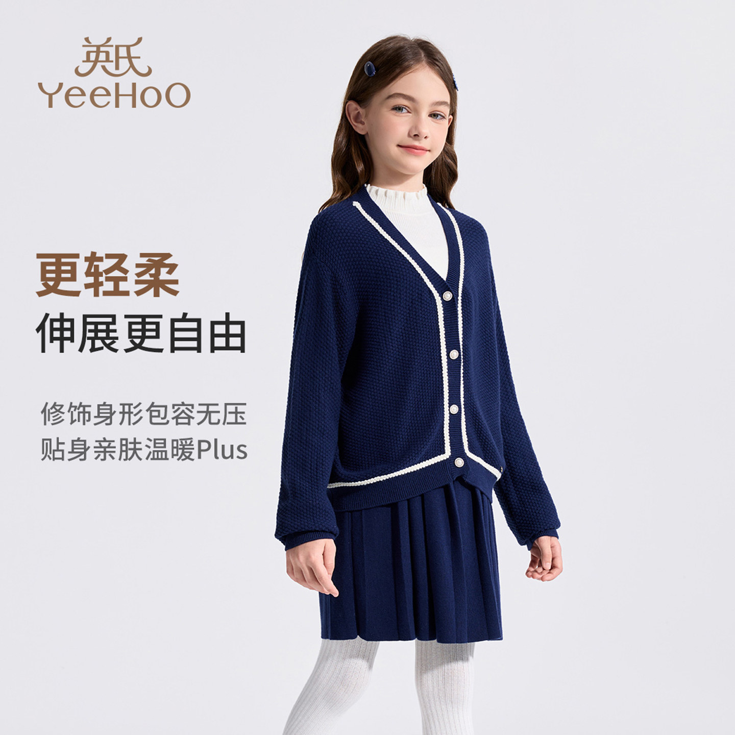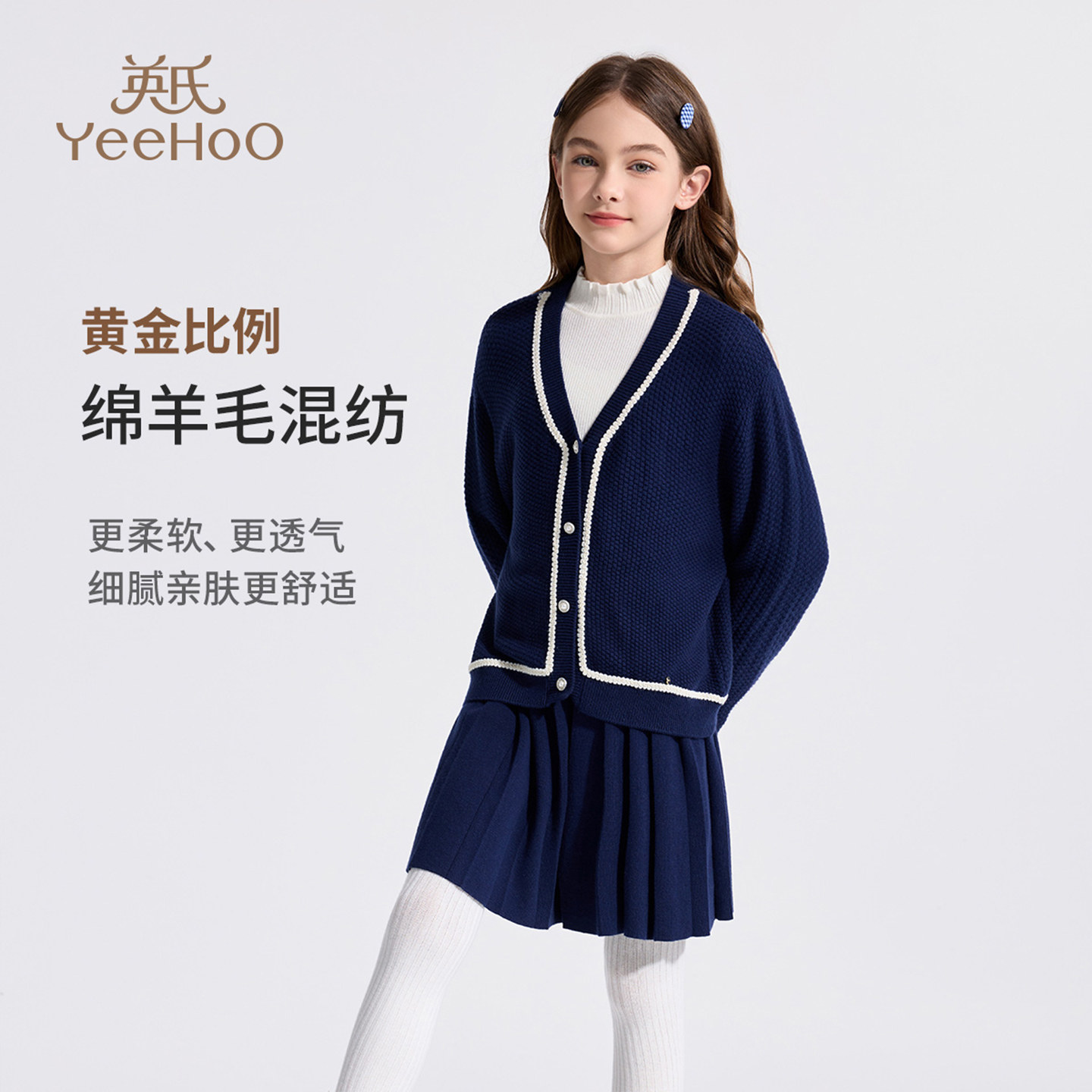 英氏女童套装2026春装新款儿童小香风针织开衫外套百褶裙子两件套