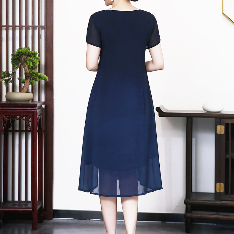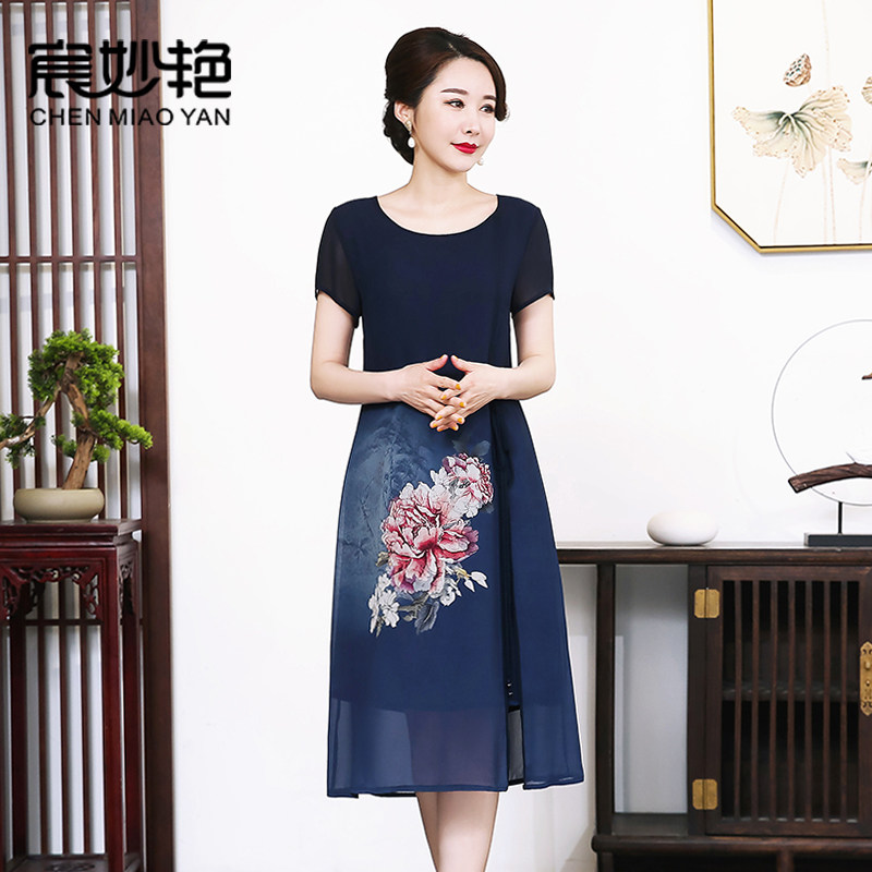 夏季新款阔太太名媛气质雪纺连衣裙短袖中长款妈妈日常印花裙子女