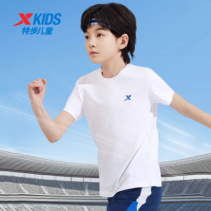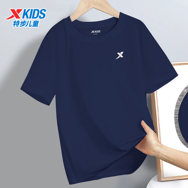 特步儿童纯棉T恤短袖夏季跑步运动服官方旗舰店正品蓝色休闲上衣