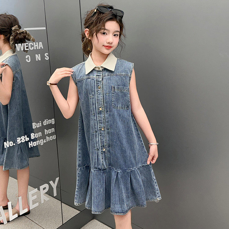 韩版polo领无袖牛仔连衣裙女童夏季小个子A字裙中裙2026透气薄款