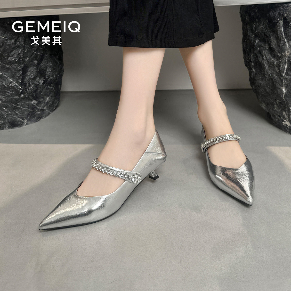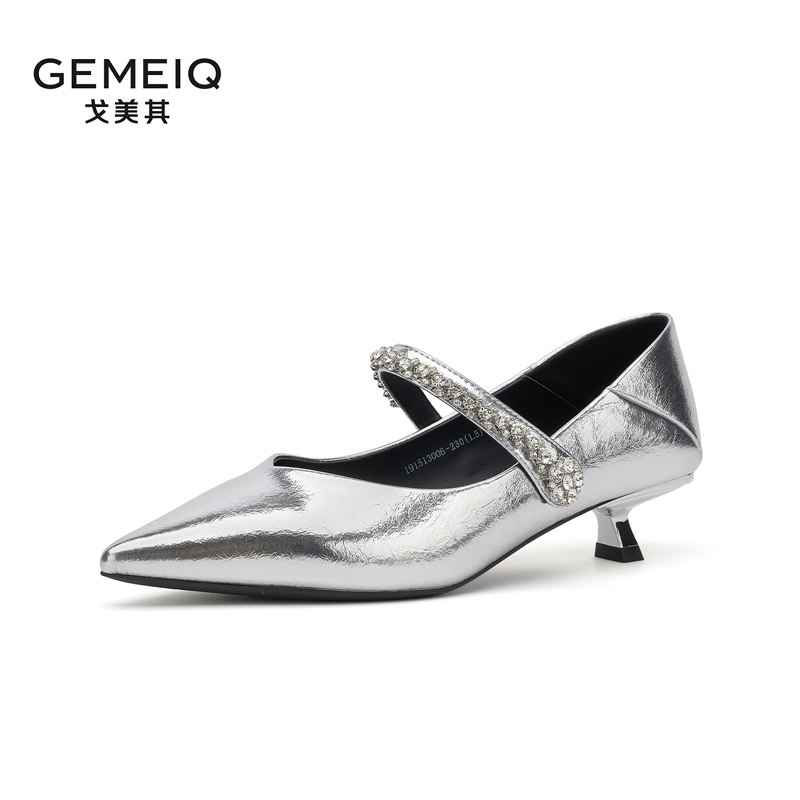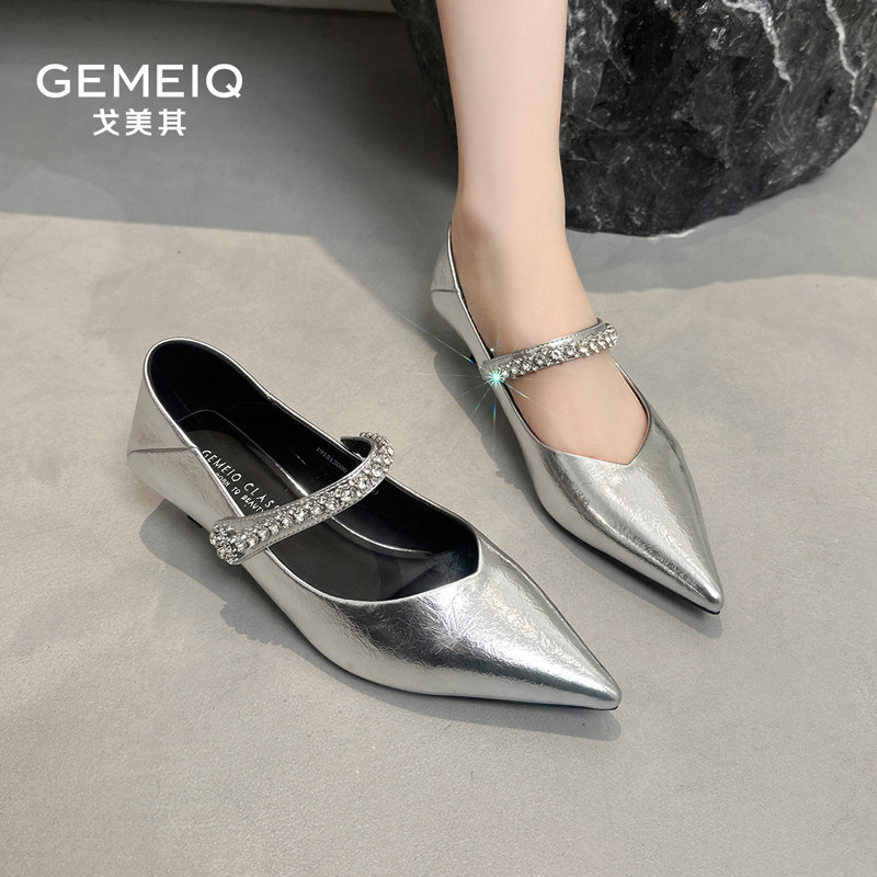 戈美其法式尖头一字带玛丽珍女鞋春秋季新款细跟银色单鞋子配裙子
