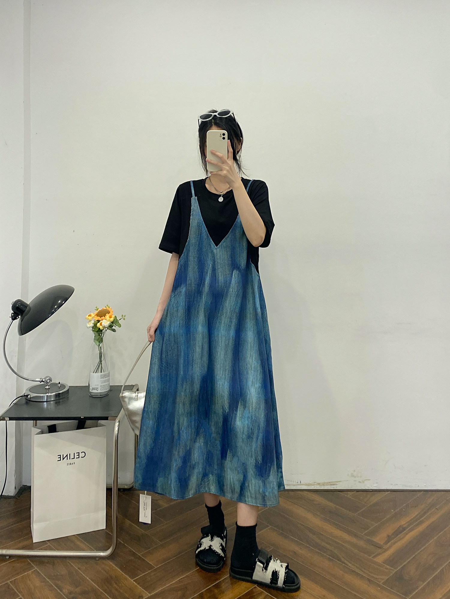 假两件吊带连衣裙女夏新款胖mm大码宽松遮肚子显瘦短袖T恤长裙子