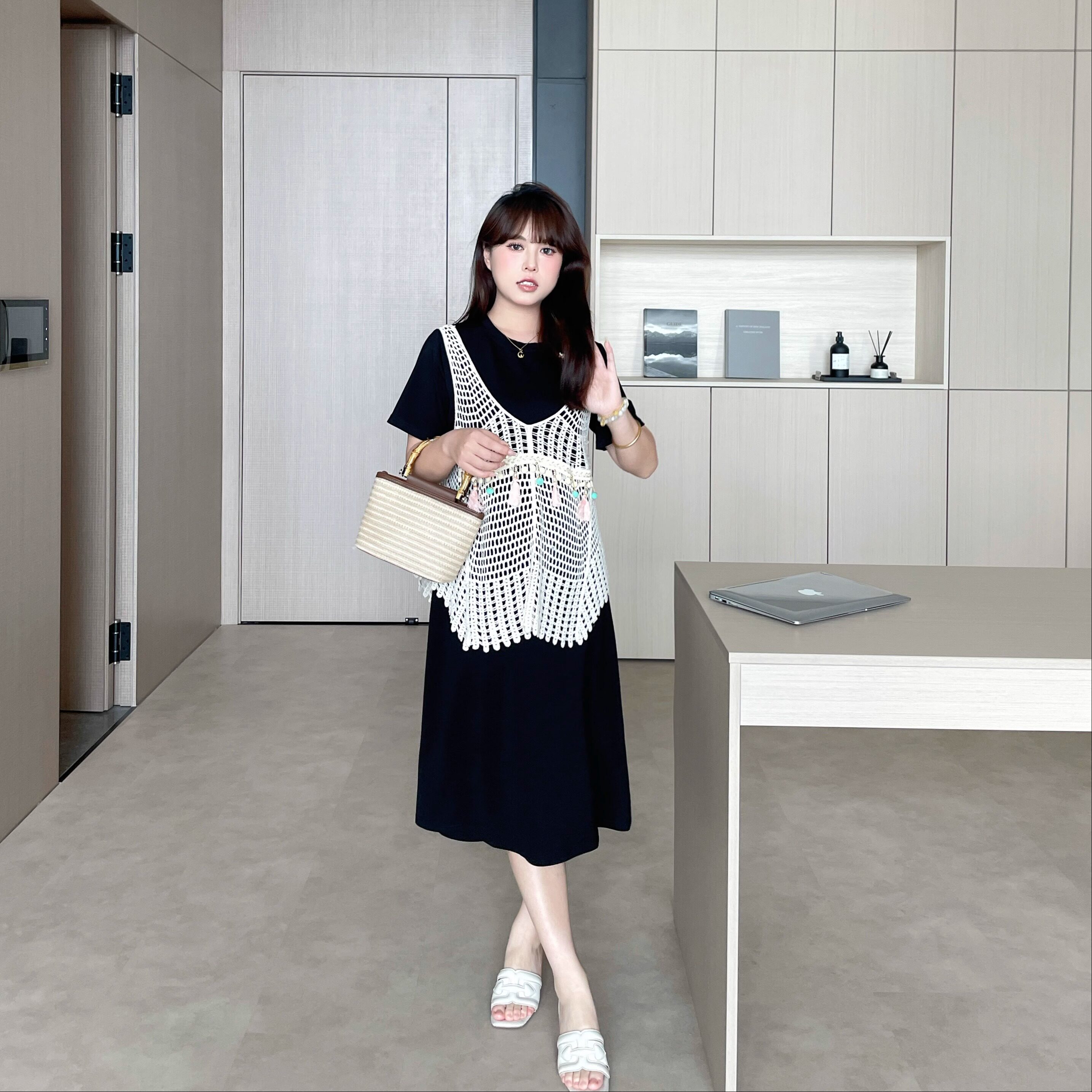 大码女装胖mm显瘦【蔷薇花】拼接解流苏马甲连衣裙两件套装夏季